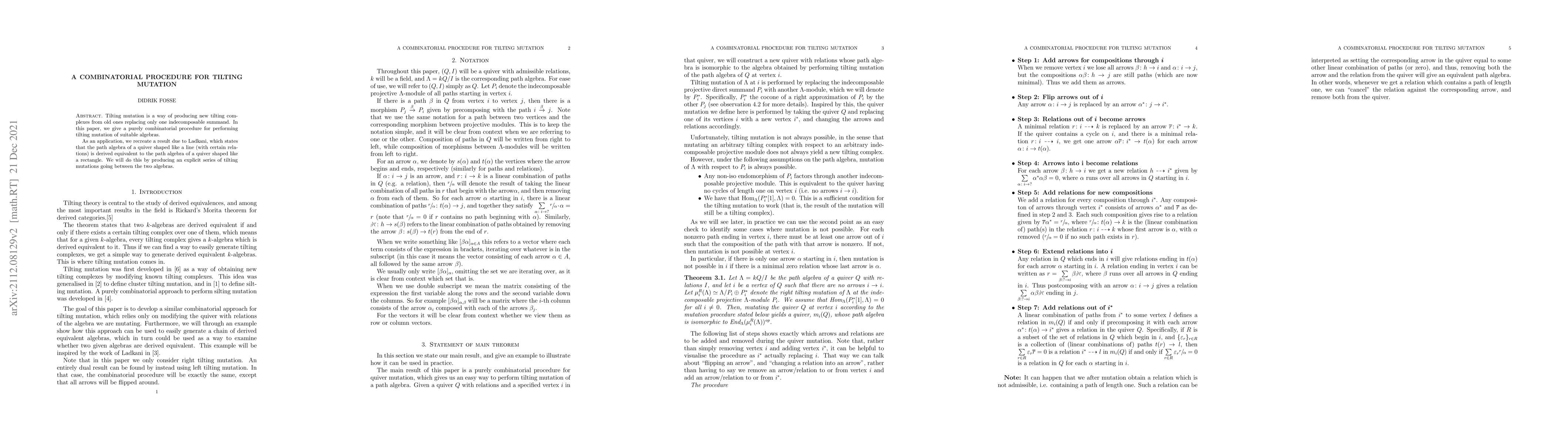 This paper introduces a combinatorial method for tilting mutation to generate new tilting complexes by replacing a single indecomposable summand. It applies this method to demonstrate a derived equivalence between the path algebras of line and rectangular quivers, as originally shown by Ladkani.