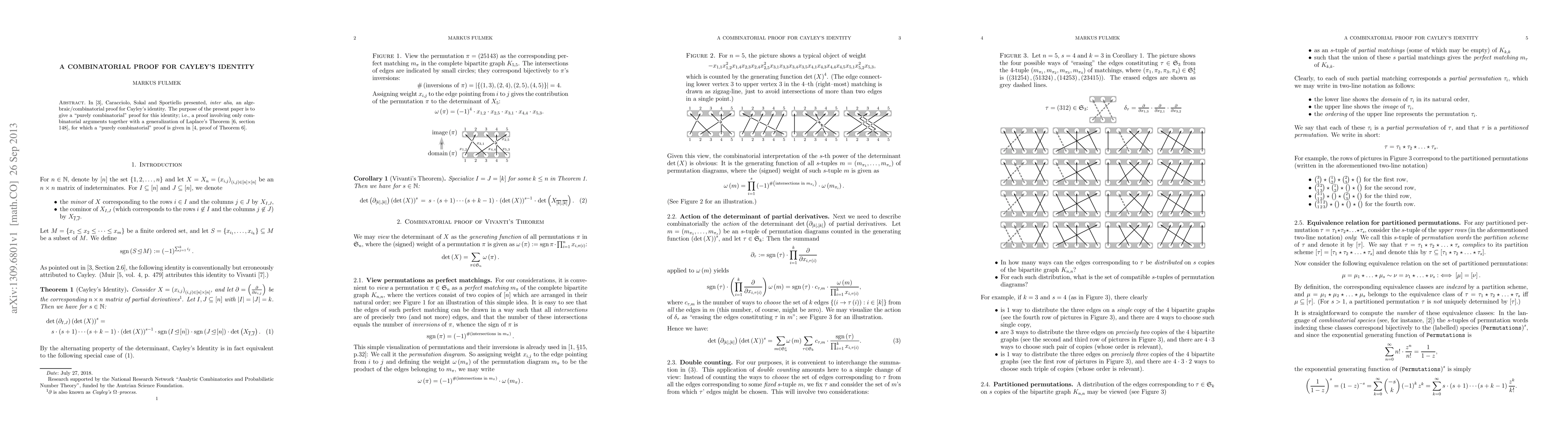 This paper provides a purely combinatorial proof for Cayley's identity using combinatorial arguments and a generalized version of Laplace's Theorem, which itself has a known combinatorial proof.