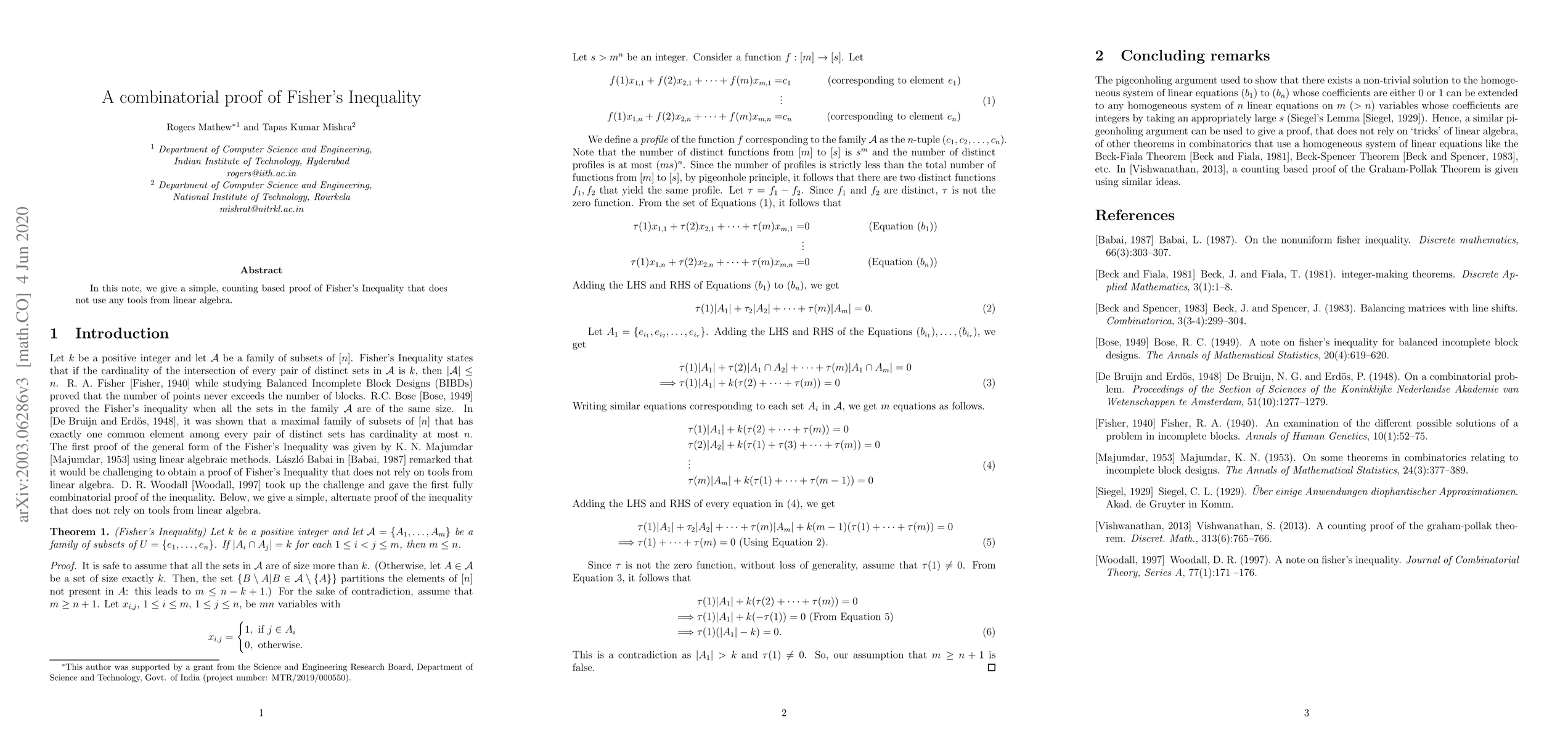 Summary: This paper provides a straightforward combinatorial proof of Fisher's Inequality, relying solely on counting arguments without employing linear algebra techniques.