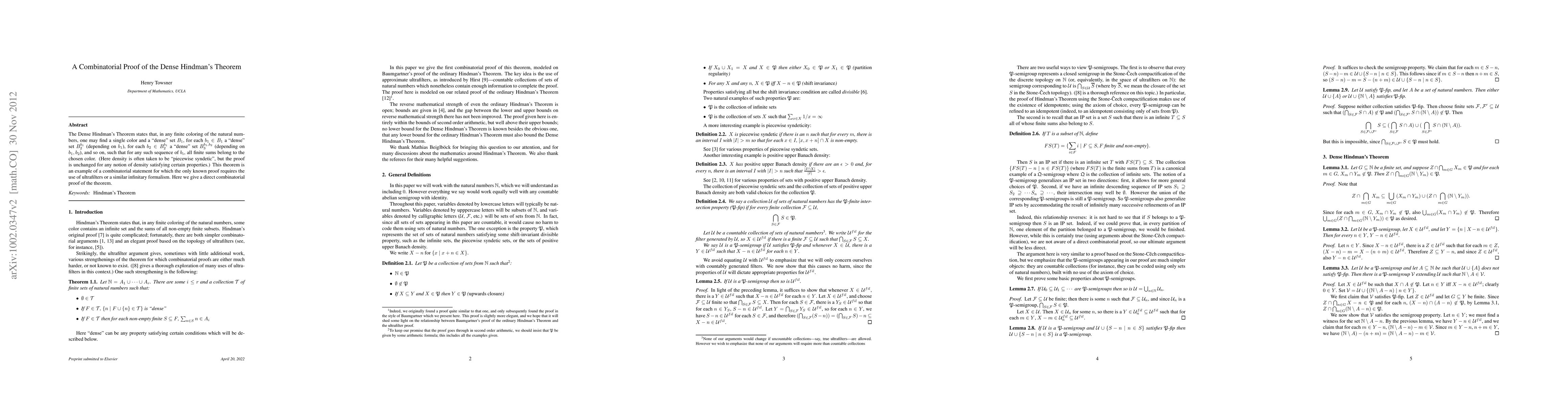 The Dense Hindman's Theorem states that, in any finite coloring of the integers, one may find a single color and a "dense" set $B_1$, for each $b_1\in B_1$ a "dense" set $B_2^{b_1}$ (depending on $b_1$), for each $b_2\in B_2^{b_1}$ a "dense" set $B_3^{b_1,b_2}$ (depending on $b_1,b_2$), and so on, such that for any such sequence of $b_i$, all finite sums belong to the chosen color. (Here density is often taken to be "piecewise syndetic", but the proof is unchanged for any notion of density satisfying certain properties.) This theorem is an example of a combinatorial statement for which the only known proof requires the use of ultrafilters or a similar infinitary formalism. Here we give a direct combinatorial proof of the theorem.