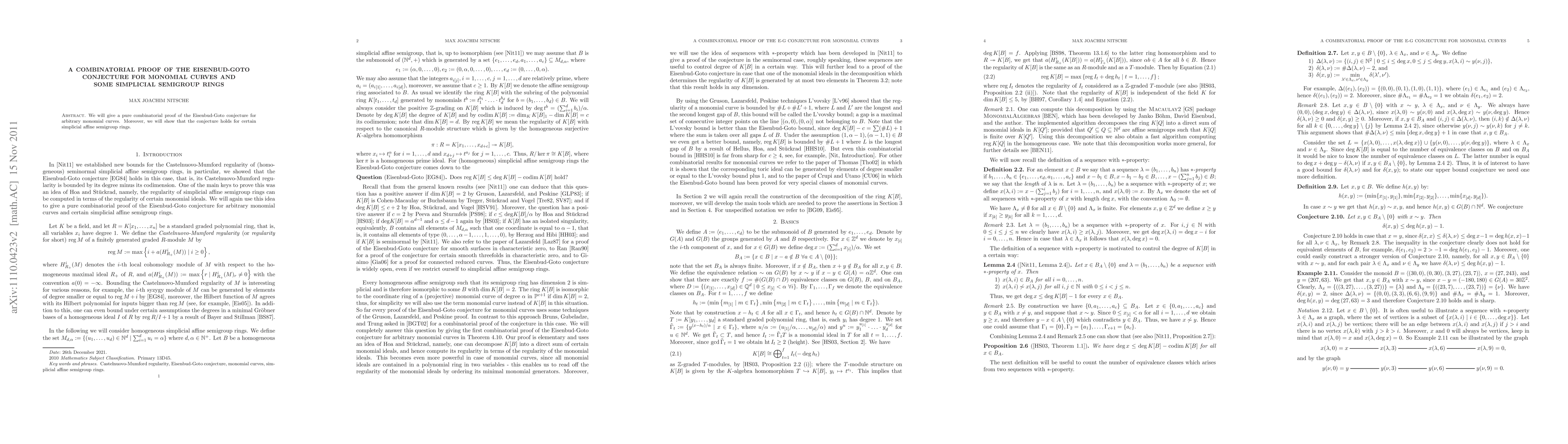 Researchers prove the Eisenbud-Goto conjecture for monomial curves using a combinatorial approach, extending its validity to certain simplicial semigroup rings.