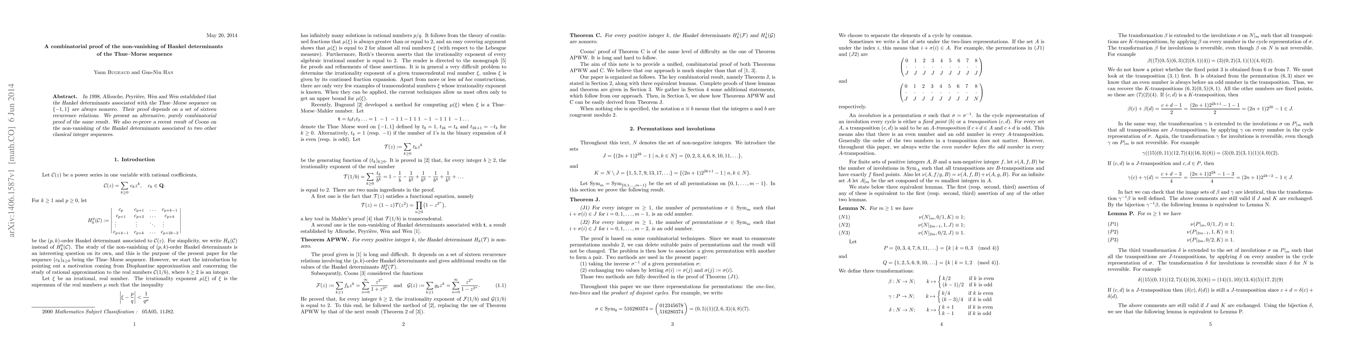 This paper presents a combinatorial proof for the non-vanishing of Hankel determinants of the Thue-Morse sequence, contrasting with the earlier recurrence relation-based proof. It also extends the result to two other classical integer sequences.