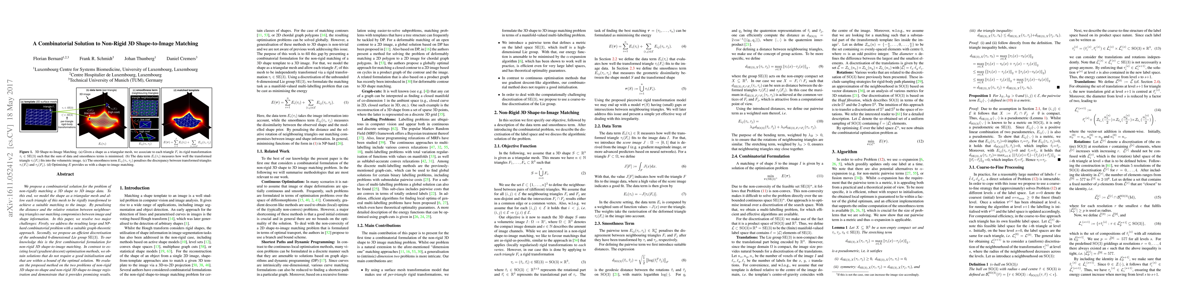 We propose a combinatorial solution for the problem of non-rigidly matching a 3D shape to 3D image data. To this end, we model the shape as a triangular mesh and allow each triangle of this mesh to be rigidly transformed to achieve a suitable matching to the image. By penalising the distance and the relative rotation between neighbouring triangles our matching compromises between image and shape information. In this paper, we resolve two major challenges: Firstly, we address the resulting large and NP-hard combinatorial problem with a suitable graph-theoretic approach. Secondly, we propose an efficient discretisation of the unbounded 6-dimensional Lie group SE(3). To our knowledge this is the first combinatorial formulation for non-rigid 3D shape-to-image matching. In contrast to existing local (gradient descent) optimisation methods, we obtain solutions that do not require a good initialisation and that are within a bound of the optimal solution. We evaluate the proposed method on the two problems of non-rigid 3D shape-to-shape and non-rigid 3D shape-to-image registration and demonstrate that it provides promising results.