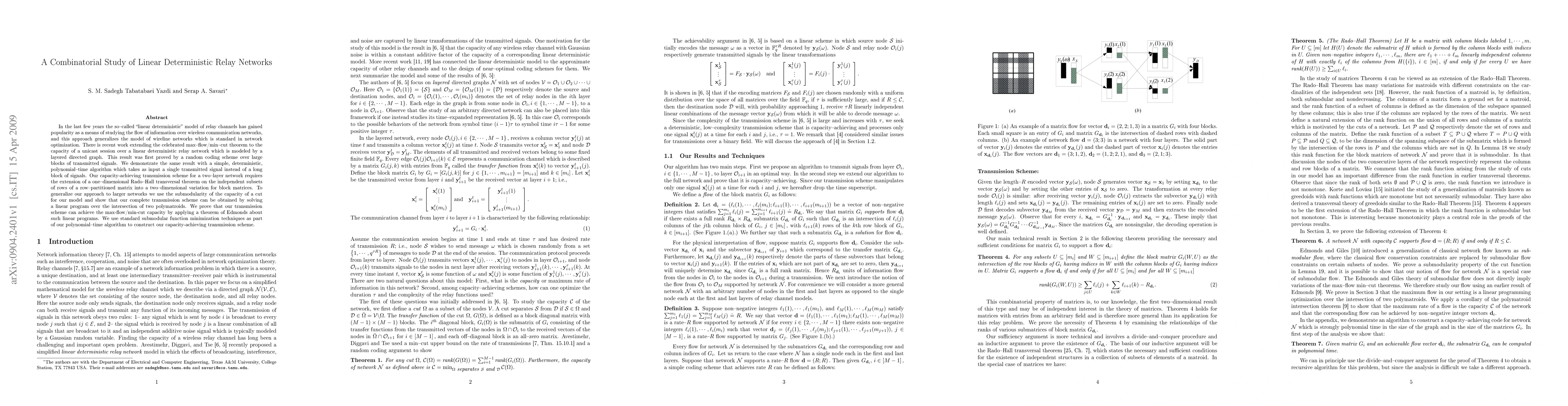 In the last few years the so--called "linear deterministic" model of relay channels has gained popularity as a means of studying the flow of information over wireless communication networks, and this approach generalizes the model of wireline networks which is standard in network optimization. There is recent work extending the celebrated max--flow/min--cut theorem to the capacity of a unicast session over a linear deterministic relay network which is modeled by a layered directed graph. This result was first proved by a random coding scheme over large blocks of transmitted signals. We demonstrate the same result with a simple, deterministic, polynomial--time algorithm which takes as input a single transmitted signal instead of a long block of signals. Our capacity-achieving transmission scheme for a two--layer network requires the extension of a one--dimensional Rado--Hall transversal theorem on the independent subsets of rows of a row--partitioned matrix into a two--dimensional variation for block matrices. To generalize our approach to larger networks we use the submodularity of the capacity of a cut for our model and show that our complete transmission scheme can be obtained by solving a linear program over the intersection of two polymatroids. We prove that our transmission scheme can achieve the max-flow/min-cut capacity by applying a theorem of Edmonds about such linear programs. We use standard submodular function minimization techniques as part of our polynomial--time algorithm to construct our capacity-achieving transmission scheme.
