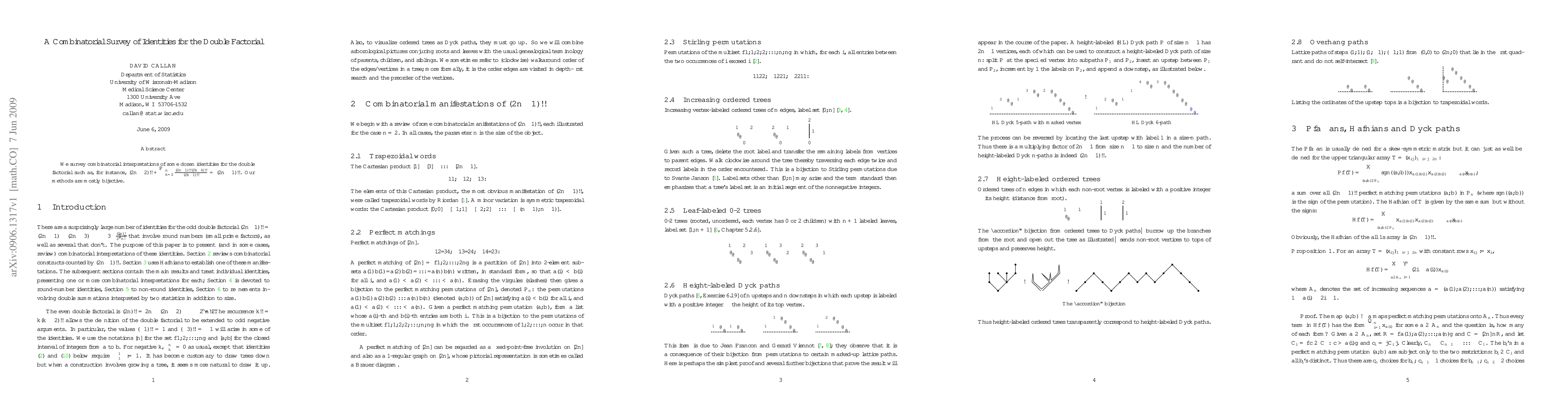 The paper surveys combinatorial identities for the double factorial, providing bijective methods to prove key relationships. It highlights a dozen interpretations of these identities, showcasing their connections to different areas of mathematics.