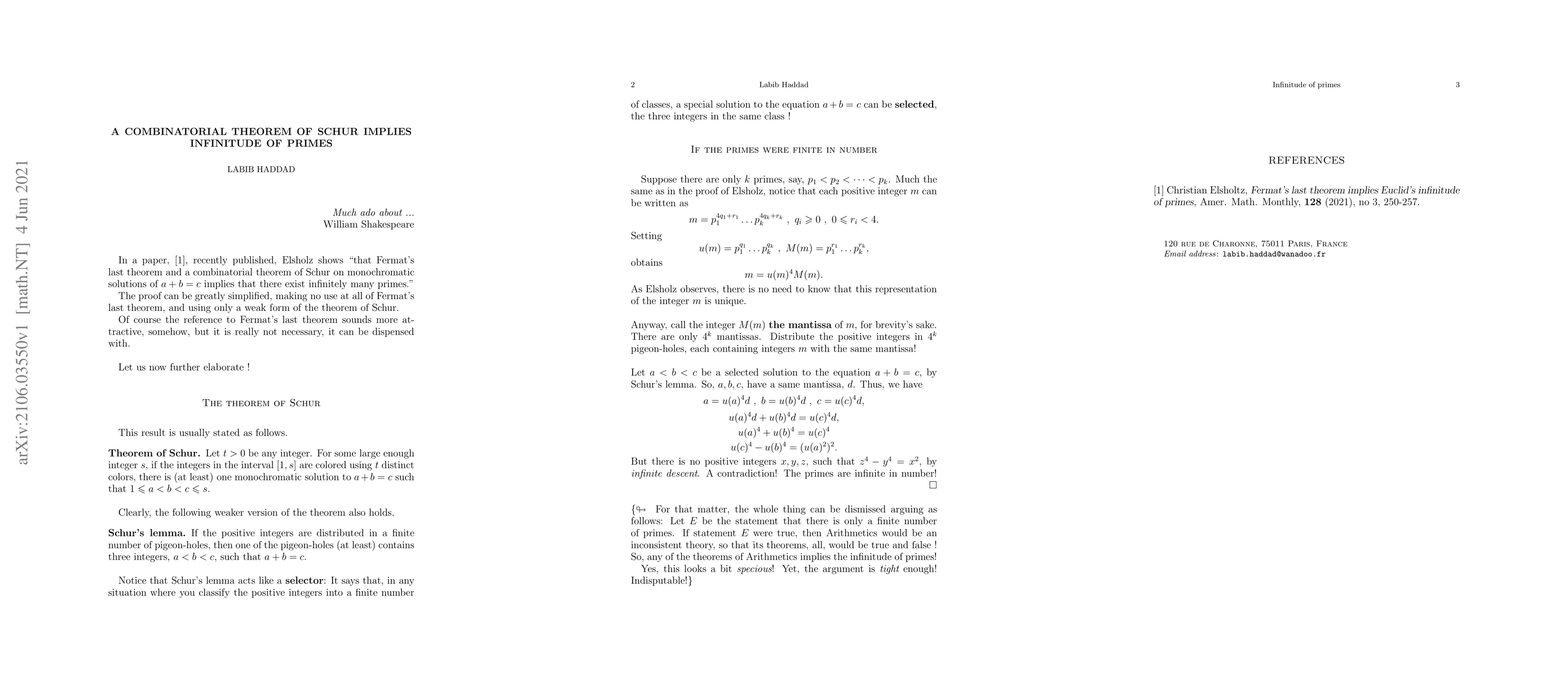 Comments about the paper by Elsholz, Fermat's last theorem implies Euclid's infinitude of primes, (2021), and simplification.