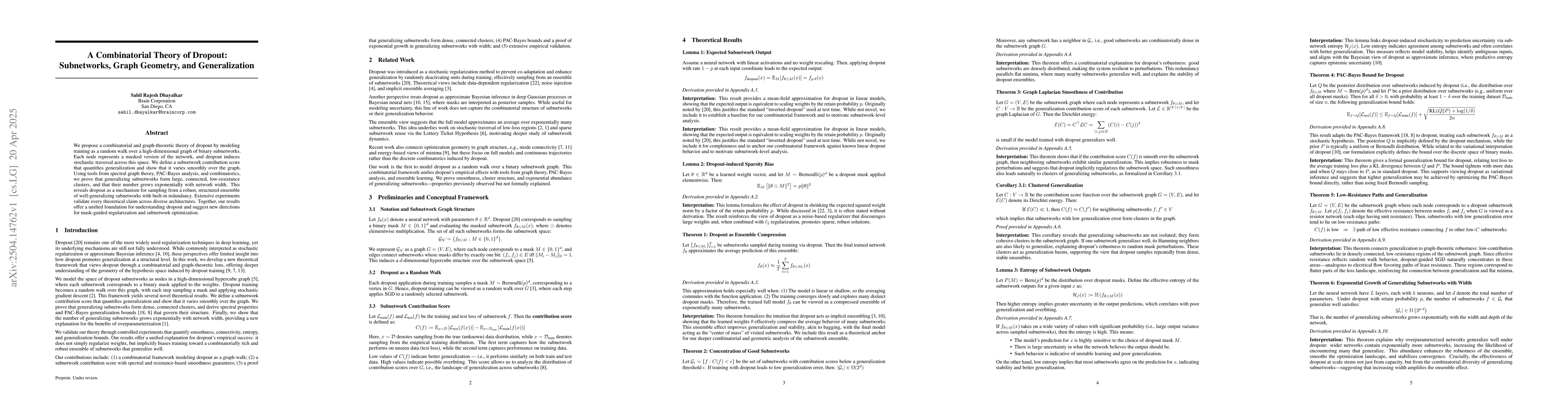 We propose a combinatorial and graph-theoretic theory of dropout by modeling training as a random walk over a high-dimensional graph of binary subnetworks. Each node represents a masked version of the network, and dropout induces stochastic traversal across this space. We define a subnetwork contribution score that quantifies generalization and show that it varies smoothly over the graph. Using tools from spectral graph theory, PAC-Bayes analysis, and combinatorics, we prove that generalizing subnetworks form large, connected, low-resistance clusters, and that their number grows exponentially with network width. This reveals dropout as a mechanism for sampling from a robust, structured ensemble of well-generalizing subnetworks with built-in redundancy. Extensive experiments validate every theoretical claim across diverse architectures. Together, our results offer a unified foundation for understanding dropout and suggest new directions for mask-guided regularization and subnetwork optimization.