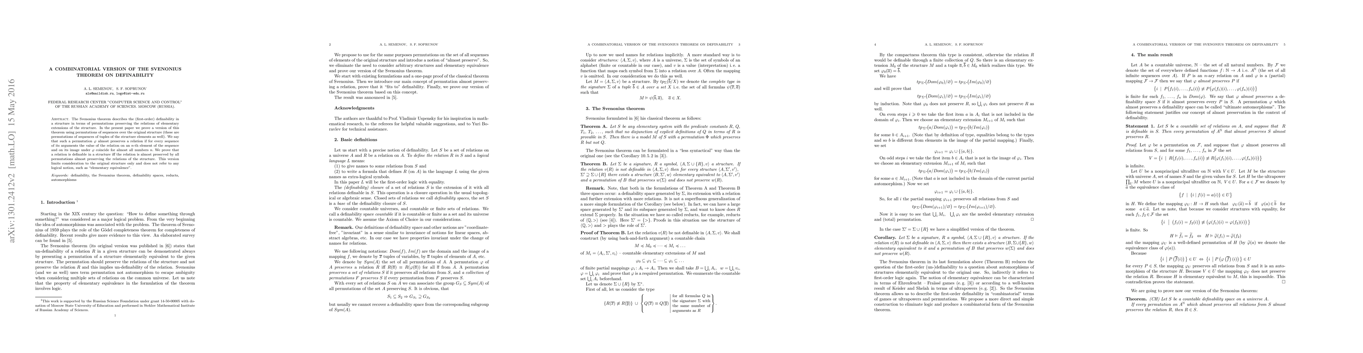 Researchers prove a version of the Svenonius theorem using sequence permutations, showing a relation is definable if it's almost preserved by all relevant permutations.