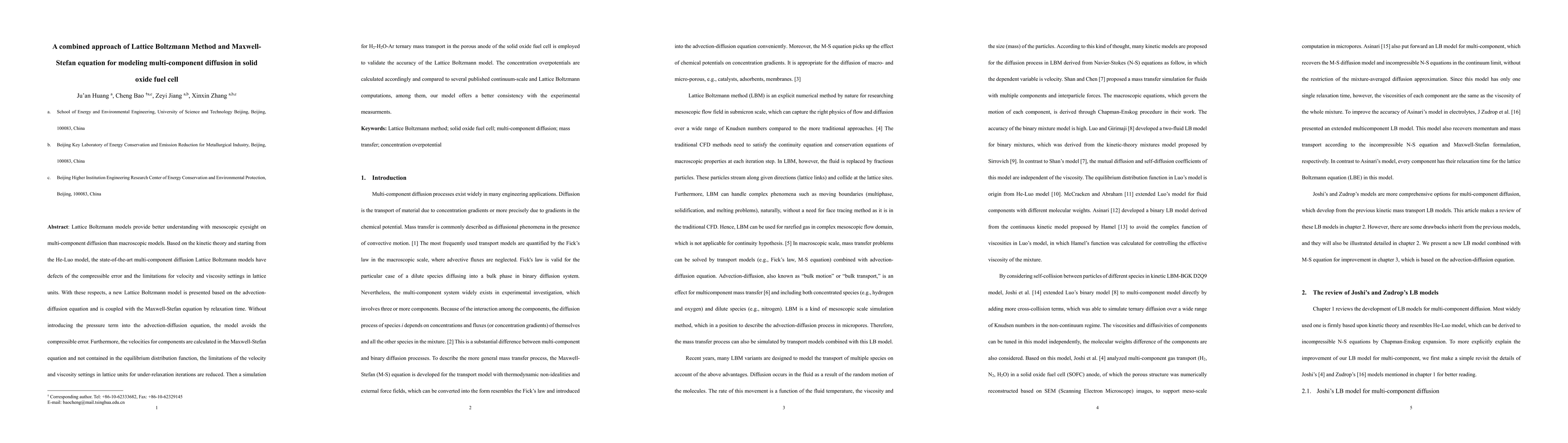 This paper proposes a novel combined Lattice Boltzmann Method (LBM) and Maxwell-Stefan equation approach to model multi-component diffusion in solid oxide fuel cells, addressing the compressible error and velocity/viscosity limitations of existing LBM models. The new model, validated through ternary mass transport simulation in a porous anode, shows improved consistency with experimental measurements compared to other methods.