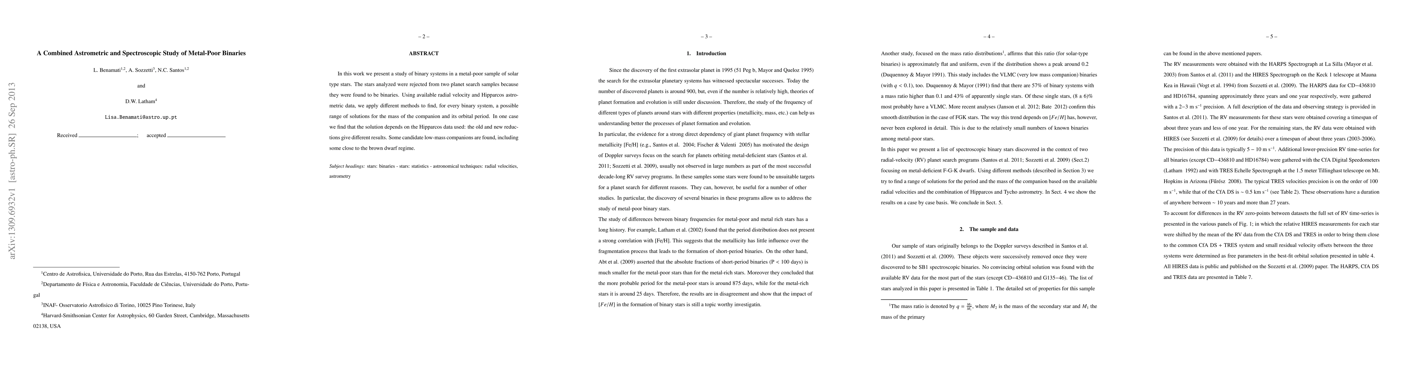 In this work we present a study of binary systems in a metal-poor sample of solar type stars. The stars analyzed were rejected from two planet search samples because they were found to be binaries. Using available radial velocity and Hipparcos astrometric data, we apply different methods to find, for every binary system, a possible range of solutions for the mass of the companion and its orbital period. In one case we find that the solution depends on the Hipparcos data used: the old and new reductions give different results. Some candidate low-mass companions are found, including some close to the brown dwarf regime.