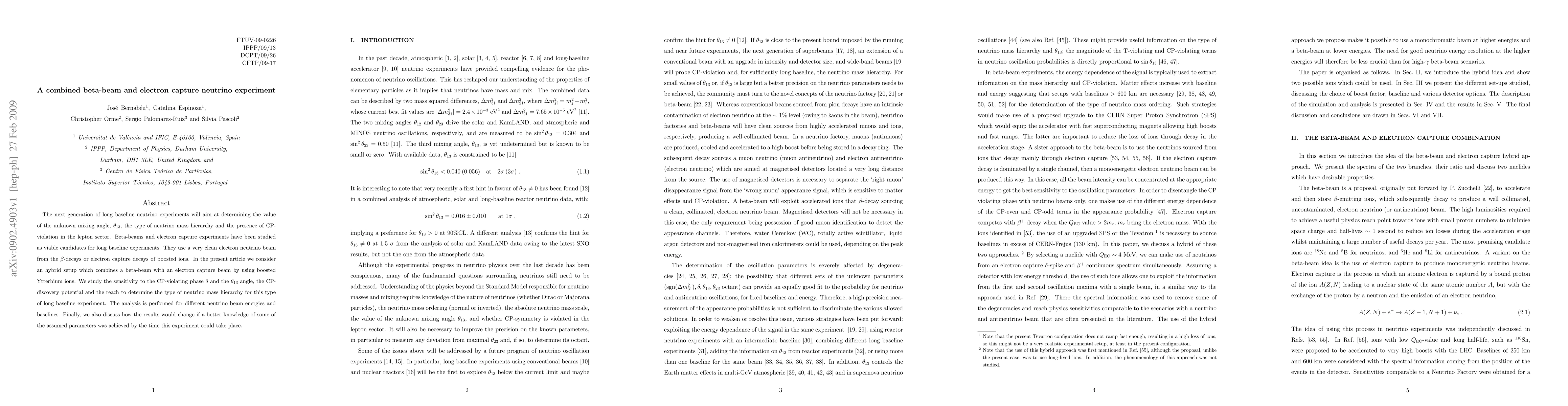 The next generation of long baseline neutrino experiments will aim at determining the value of the unknown mixing angle, theta_{13}, the type of neutrino mass hierarchy and the presence of CP-violation in the lepton sector. Beta-beams and electron capture experiments have been studied as viable candidates for long baseline experiments. They use a very clean electron neutrino beam from the beta-decays or electron capture decays of boosted ions. In the present article we consider an hybrid setup which combines a beta-beam with an electron capture beam by using boosted Ytterbium ions. We study the sensitivity to the CP-violating phase delta and the theta_{13} angle, the CP-discovery potential and the reach to determine the type of neutrino mass hierarchy for this type of long baseline experiment. The analysis is performed for different neutrino beam energies and baselines. Finally, we also discuss how the results would change if a better knowledge of some of the assumed parameters was achieved by the time this experiment could take place.