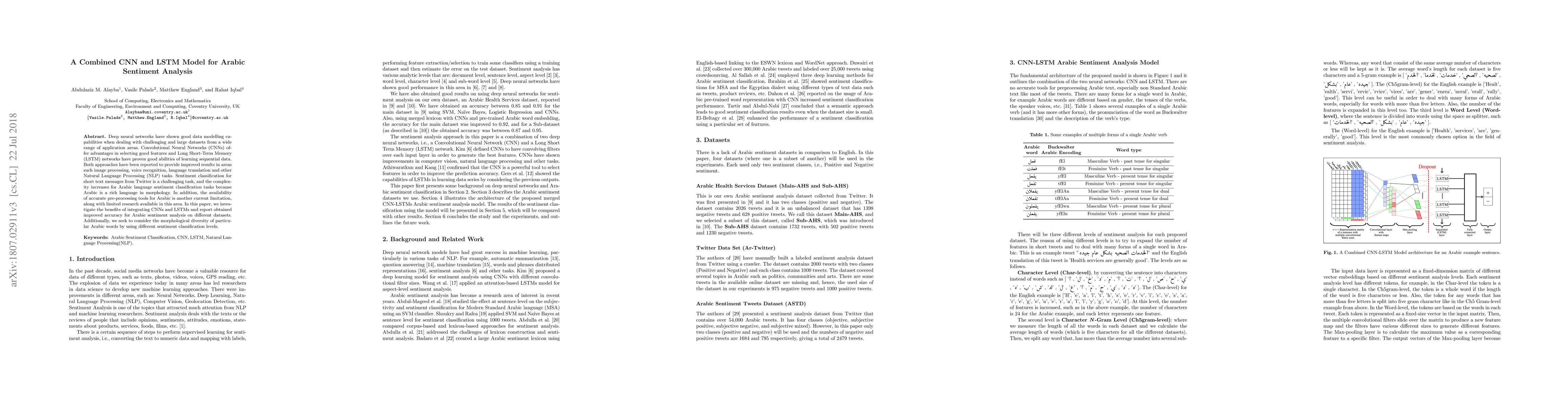 This paper explores a combined CNN and LSTM model for Arabic sentiment analysis, reporting improved accuracy due to the integrated benefits of both networks. The study addresses the morphological complexity of Arabic and evaluates sentiment classification at different levels.