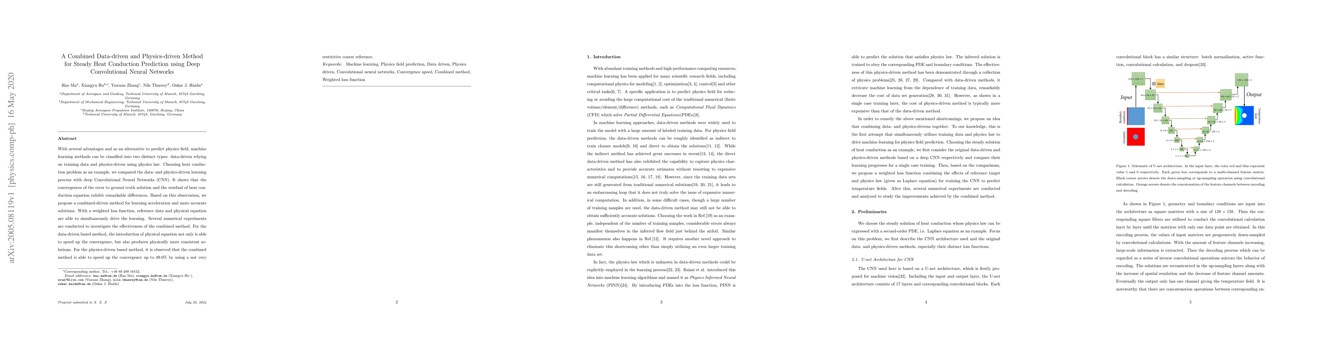 This paper proposes a hybrid method combining data-driven and physics-driven approaches using deep Convolutional Neural Networks for steady heat conduction prediction. The combined method accelerates convergence and produces more accurate, physically consistent solutions compared to standalone methods.