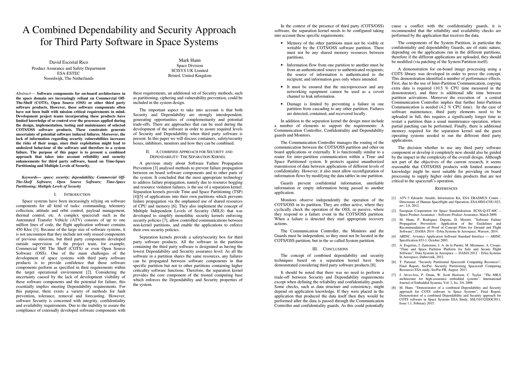 This paper proposes a combined dependability and security approach for third party software used in space systems, addressing the risks of software-induced failures and security vulnerabilities. It utilizes Time-Space Partitioning and Multiple Levels of Security to enhance reliability and mitigate potential threats.