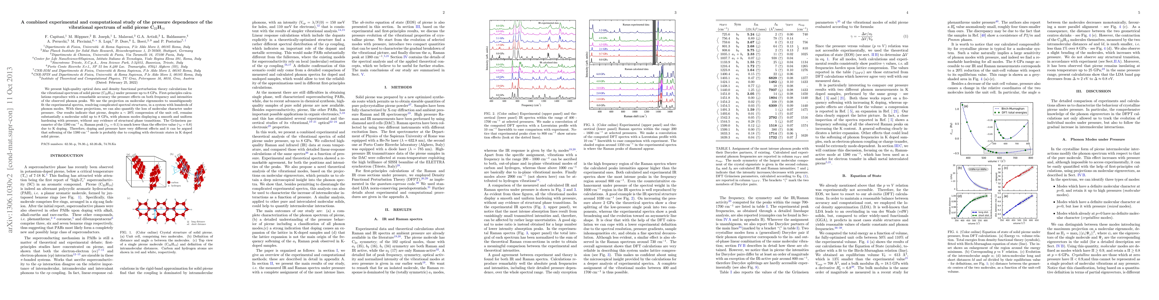This study combines experimental optical data and computational density functional theory to analyze the pressure dependence of solid picene's vibrational spectrum up to 8 GPa. The calculations accurately reproduce observed phonon peak shifts and intensities, revealing picene retains its molecular character despite significant compression, with uniform phonon hardening under pressure.