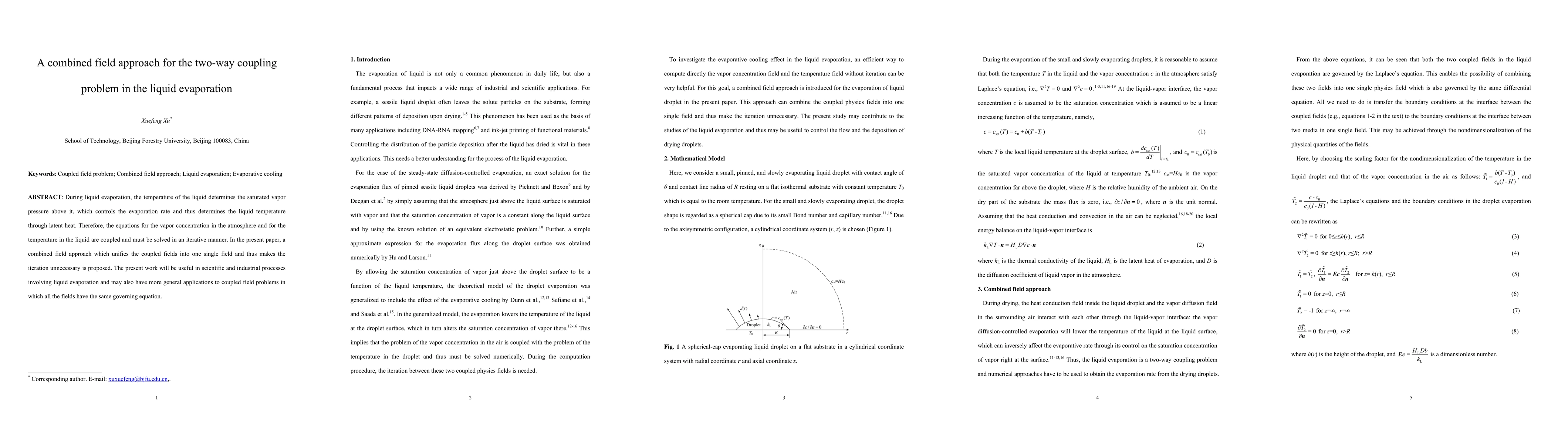 The research proposes a combined field approach to solve the two-way coupling problem in liquid evaporation, unifying the coupled fields of vapor concentration and temperature into one single field, eliminating the need for iterative solutions.