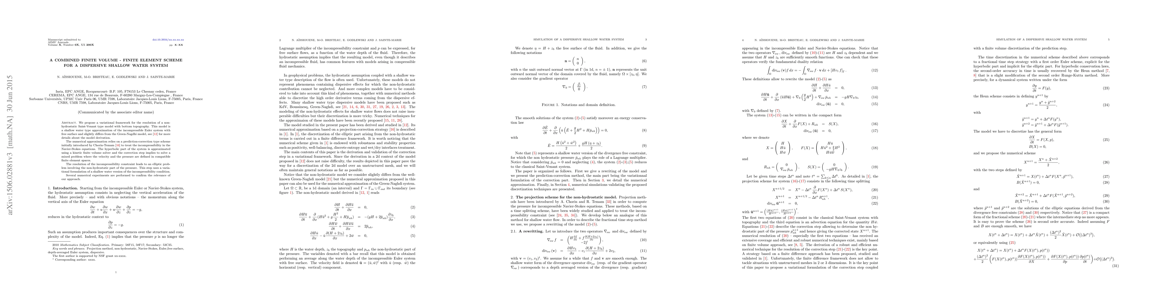 The paper proposes a hybrid finite volume-finite element scheme for resolving a non-hydrostatic Saint-Venant shallow water model, utilizing a prediction-correction method and kinetic finite volume solver for the hyperbolic part, while employing a variational approach for the incompressibility constraint. Numerical experiments validate the effectiveness of the proposed method.