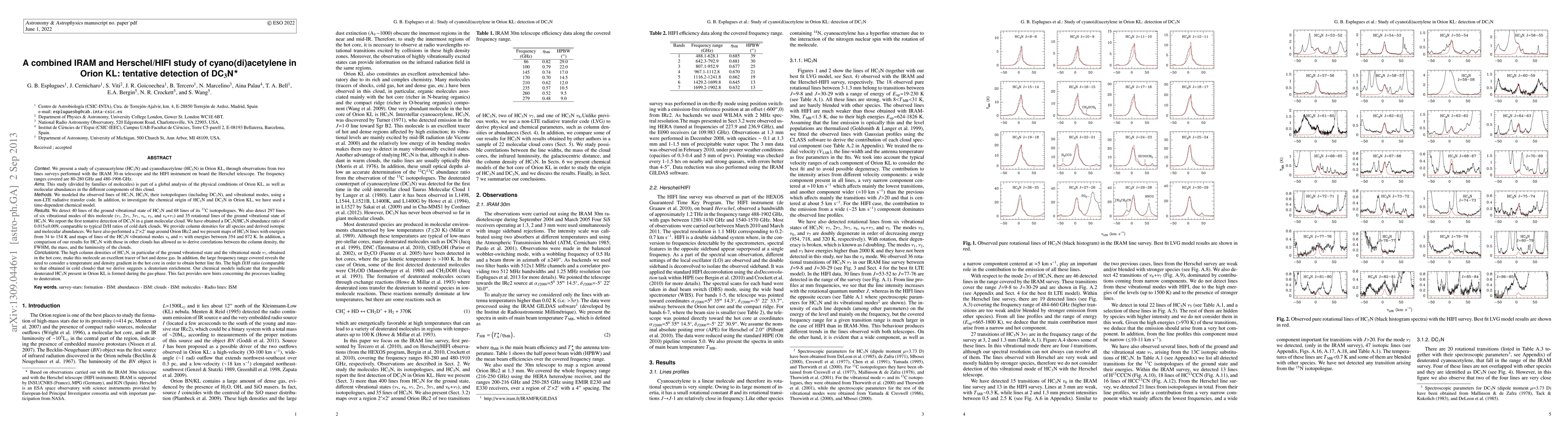 This study combines IRAM and Herschel/HIFI observations to analyze cyanoacetylene (HC3N) and cyanodiacetylene (HC5N) in Orion KL, detecting 40 lines of HC3N and 35 lines of HC5N. The first tentative detection of deuterated cyanodiacetylene (DC3N) is reported, suggesting deuterium enrichment and providing new insights into gas-phase deuteration processes.