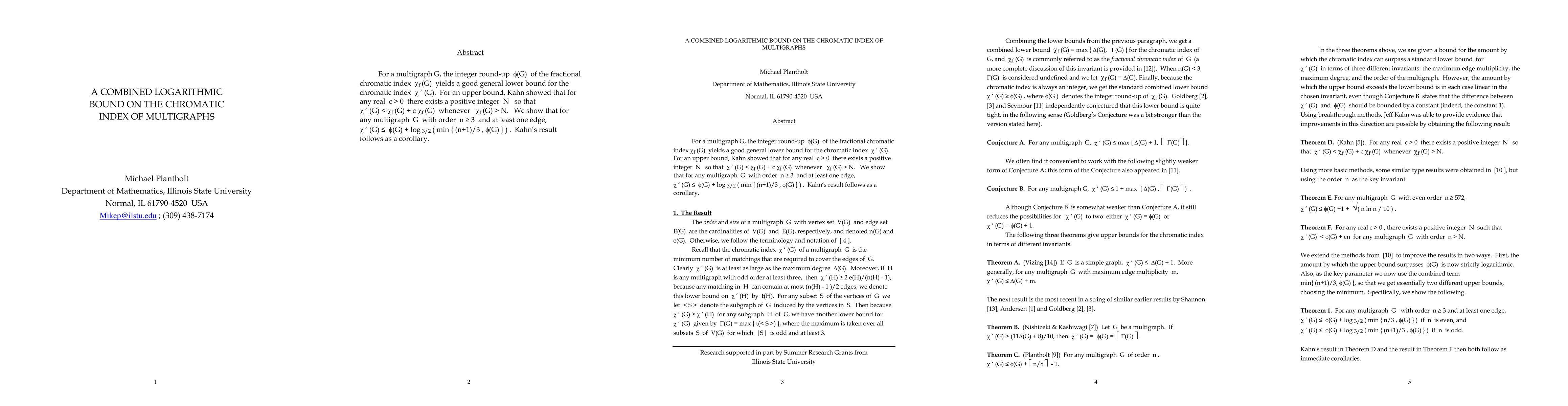 This paper establishes a logarithmic upper bound on the chromatic index of a multigraph, showing that it is at most the integer round-up of the fractional chromatic index plus log(min{(n+1)/3, phi(G)}), where n is the number of vertices. This provides a refined understanding of the relationship between the chromatic index and the fractional chromatic index.