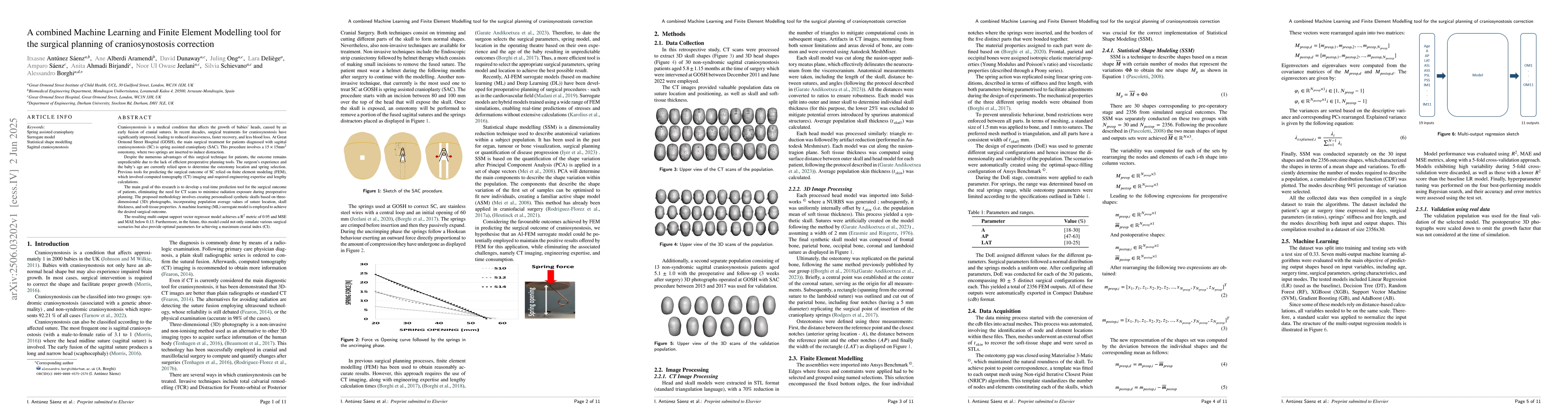 The development of a combined machine learning and finite element modeling tool for craniosynostosis surgical planning, utilizing personalized synthetic skulls and a high-performing ML model.