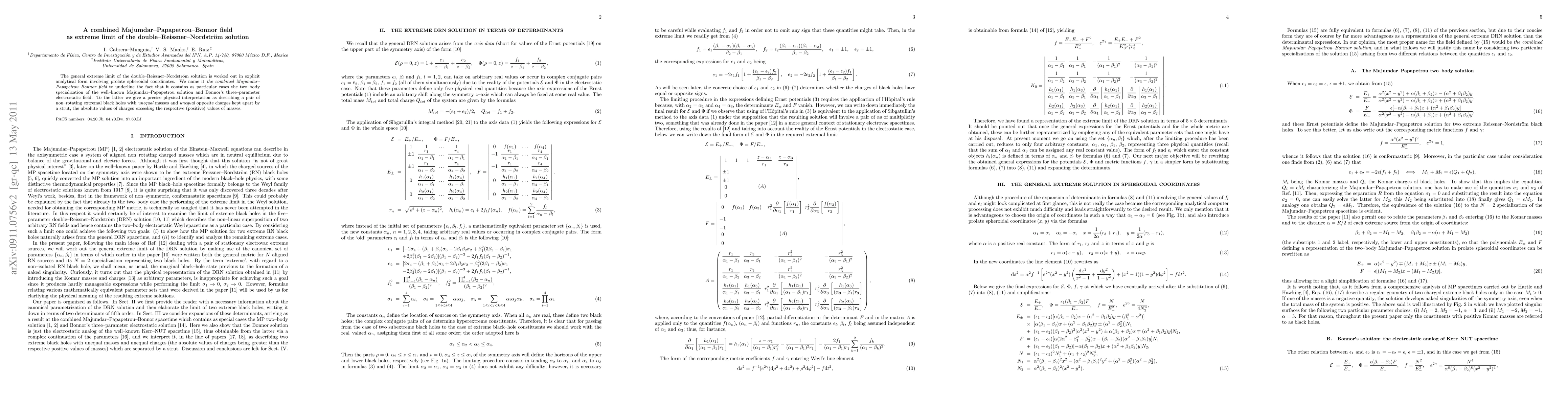The general extreme limit of the double-Reissner-Nordstrom solution is worked out in explicit analytical form involving prolate spheroidal coordinates. We name it the combined Majumdar-Papapetrou-Bonnor field to underline the fact that it contains as particular cases the two-body specialization of the well-known Majumdar-Papapetrou solution and Bonnor's three-parameter electrostatic field. To the latter we give a precise physical interpretation as describing a pair of non-rotating extremal black holes with unequal masses and unequal opposite charges kept apart by a strut, the absolute values of charges exceeding the respective (positive) values of masses.