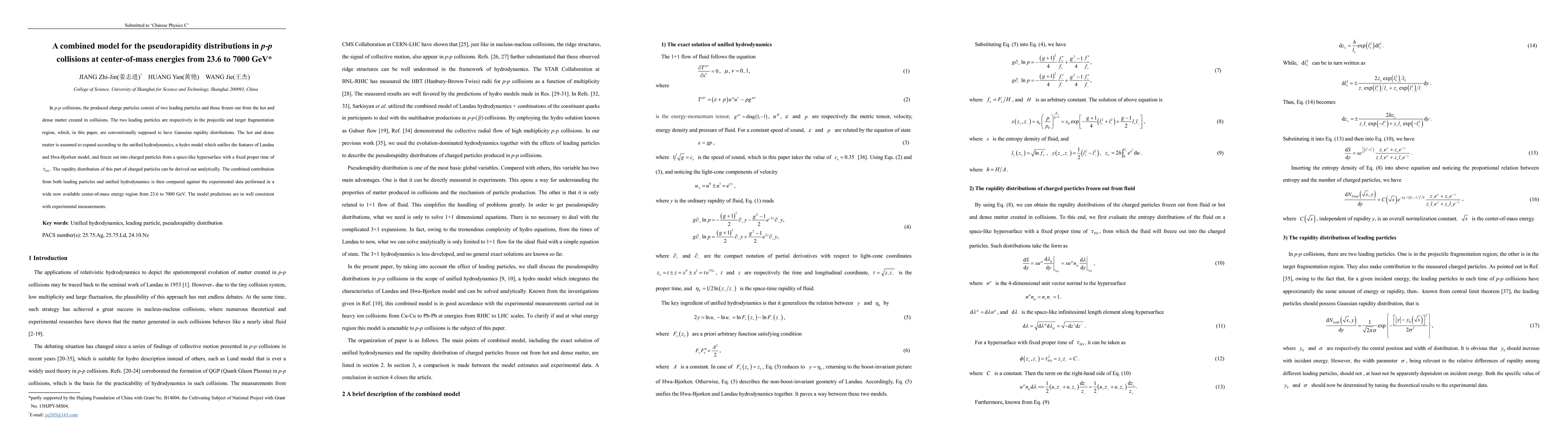 In p-p collisions, the produced charge particles consist of two leading particles and those frozen out from the hot and dense matter created in collisions. The two leading particles are respectively in the projectile and target fragmentation region, which, in this paper, are conventionally supposed to have Gaussian rapidity distributions. The hot and dense matter is assumed to expand according to the unified hydrodynamics, a hydro model which unifies the features of Landau and Hwa-Bjorken model, and freeze out into charged particles from a space-like hypersurface with a fixed proper time of Tau_FO. The rapidity distribution of this part of charged particles can be derived out analytically. The combined contribution from both leading particles and unified hydrodynamics is then compared against the experimental data performed in a wide now available center-of-mass energy region from 23.6 to 7000 GeV. The model predictions are in well consistent with experimental measurements.