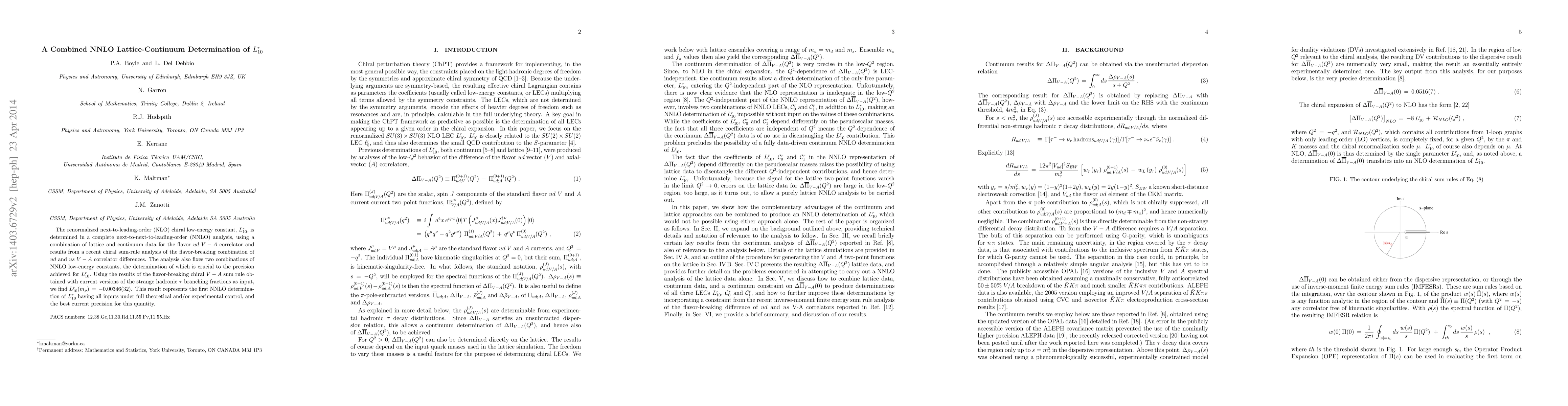 The renormalized next-to-leading-order (NLO) chiral low-energy constant, $L_{10}^r$, is determined in a complete next-to-next-to-leading-order (NNLO) analysis, using a combination of lattice and continuum data for the flavor $ud$ $V-A$ correlator and results from a recent chiral sum-rule analysis of the flavor-breaking combination of $ud$ and $us$ $V-A$ correlator differences. The analysis also fixes two combinations of NNLO low-energy constants, the determination of which is crucial to the precision achieved for $L_{10}^r$. Using the results of the flavor-breaking chiral $V-A$ sum rule obtained with current versions of the strange hadronic $\tau$ branching fractions as input, we find $L_{10}^r(m_\rho )\, =\, -0.00346(32)$. This result represents the first NNLO determination of $L_{10}^r$ having all inputs under full theoretical and/or experimental control, and the best current precision for this quantity.