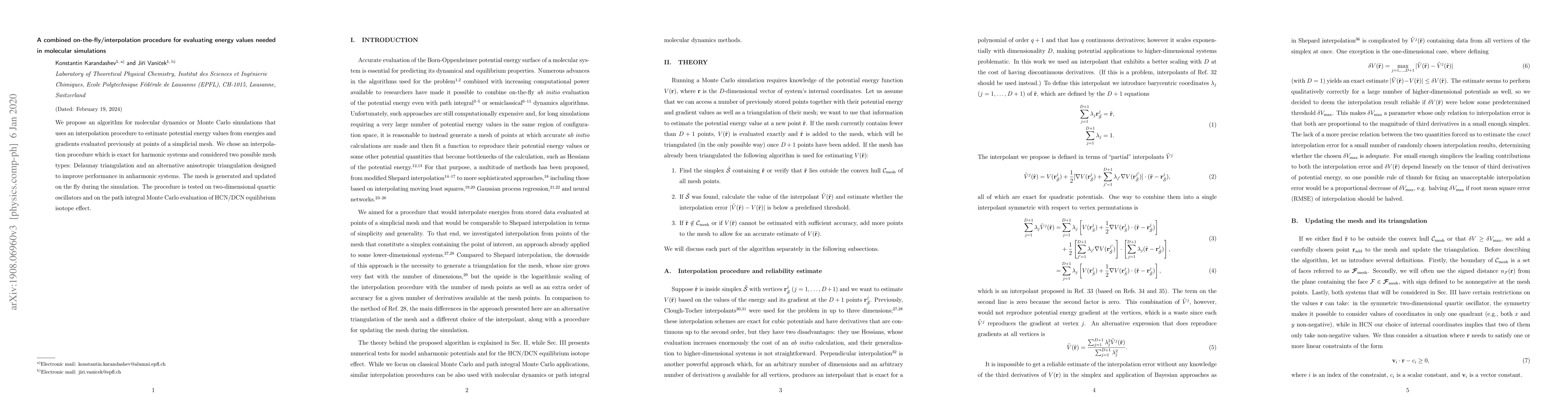 This paper introduces an algorithm for molecular simulations that employs an interpolation method to estimate potential energy values from previously computed energies and gradients, using a mesh updated on-the-fly. The method is tested on harmonic and anharmonic systems, showing improved performance with an alternative anisotropic triangulation.