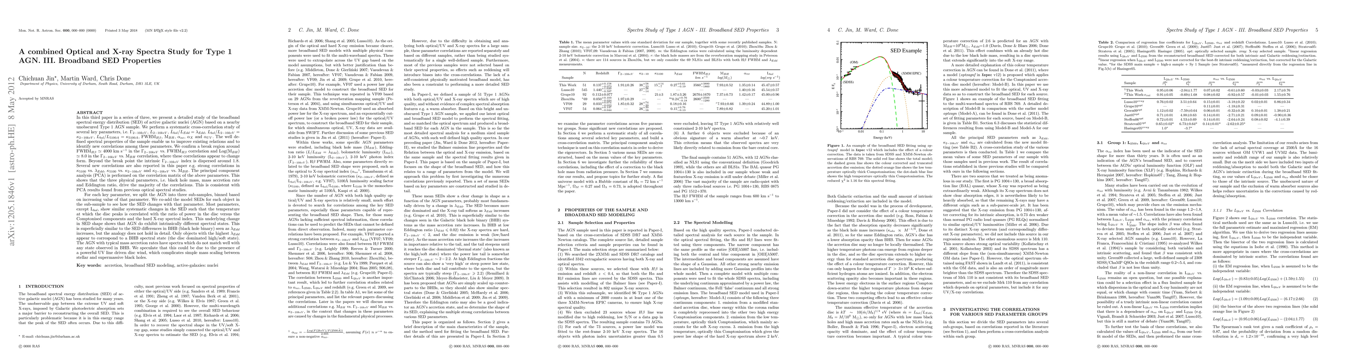 This study investigates broadband spectral properties of Type 1 Active Galactic Nuclei (AGN) using optical and X-ray spectra, revealing correlations between black hole mass, accretion rate, and Eddington ratio, as well as distinct spectral states with varying compositions.