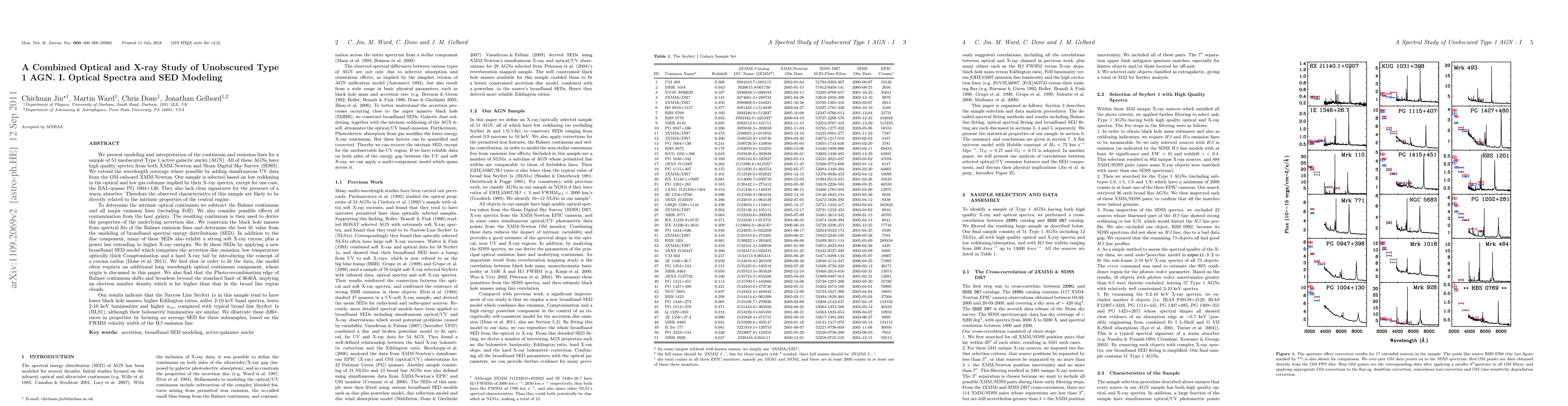 We present modeling and interpretation of the continuum and emission lines for a sample of 51 unobscured Type 1 active galactic nuclei (AGN). All of these AGNs have high quality spectra from both XMM-Newton and Sloan Digital Sky Survey (SDSS). We extend the wavelength coverage where possible by adding simultaneous UV data from the OM onboard XMM-Newton. Our sample is selected based on low reddening in the optical and low gas columns implied by their X-ray spectra. They also lack clear signatures for the presence of a warm absorber. Therefore the observed characteristics of this sample are likely to be directly related to the intrinsic properties of the central engine. We perform multi-component spectral fitting for strong optical emission lines and the whole optical spectra. We fit the combined optical, UV and X-ray data by applying a new broadband SED model which comprises the accretion disc emission, low temperature optically thick Comptonisation and a hard X-ray tail by introducing the a corona radius (Done et al. 2011). We find that in order to fit the data, the model often requires an additional long wavelength optical continuum component, whose origin is discussed in this paper. We also find that the Photo-recombination edge of Balmer continuum shifts and broadens beyond the standard limit of 3646{\AA}, implying an electron number density which is far higher than that in the broad line region clouds. Our results indicate that the Narrow Line Seyfert 1s in this sample tend to have lower black hole masses, higher Eddington ratios, softer 2-10 keV band spectra, lower 2-10 keV luminosities and higher \alpha_{ox}, compared with typical broad line Seyfert 1s (BLS1), although their bolometric luminosities are similar. We illustrate these differences in properties by forming an average SED for three subsamples, based on the FWHM velocity width of the H{\beta} emission line.