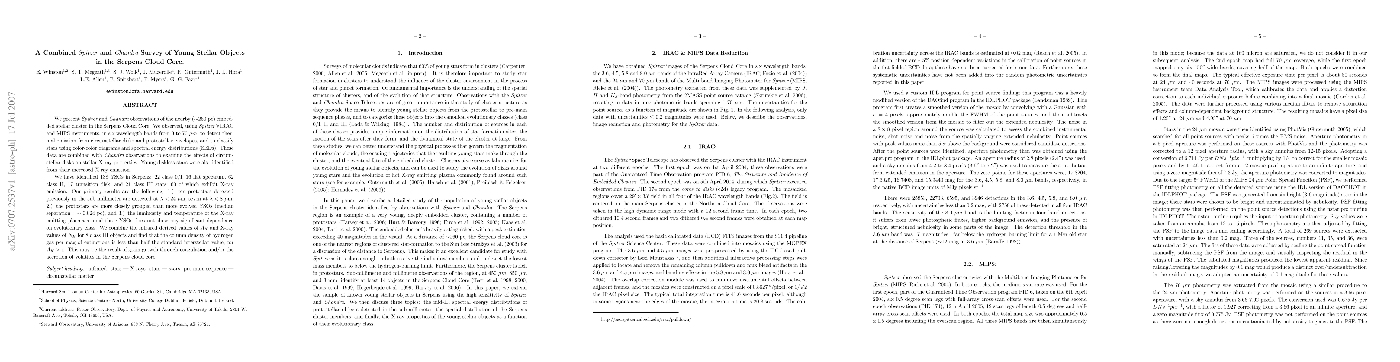 This paper combines Spitzer and Chandra observations to study young stellar objects (YSOs) in the Serpens Cloud Core, identifying 138 YSOs and examining the influence of circumstellar disks on stellar X-ray properties. Key findings include the detection of previously known protostars, closer grouping of protostars, and a lower hydrogen gas column density per extinction magnitude in class III objects.