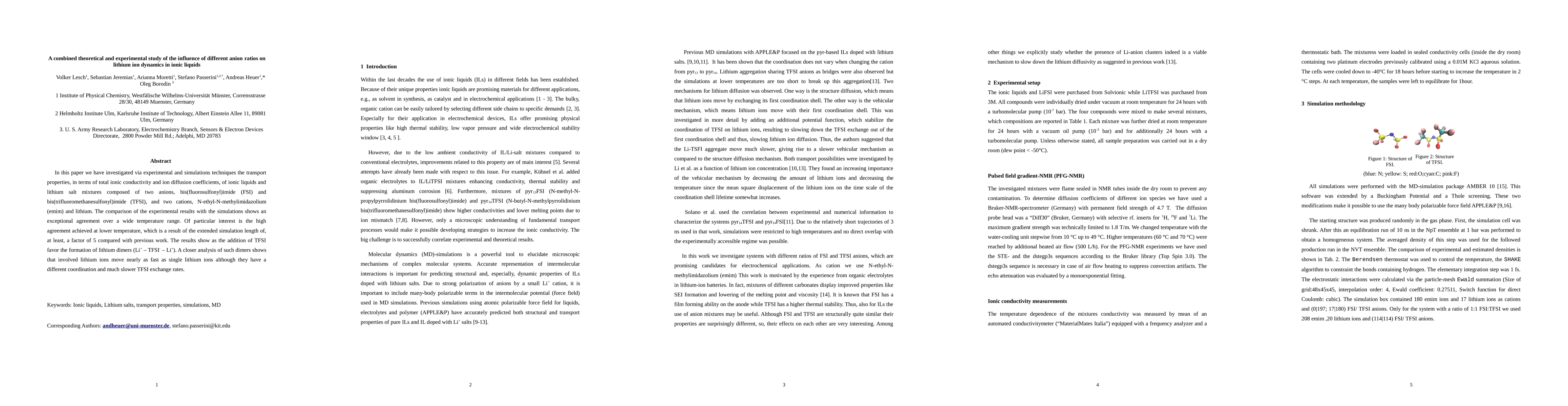 This study combines experimental and simulation techniques to examine how varying anion ratios in ionic liquids affect lithium ion dynamics, revealing that TFSI addition promotes lithium dimer formation while maintaining high ionic conductivity. The agreement between experimental results and simulations is exceptional, especially at lower temperatures due to extended simulation times.