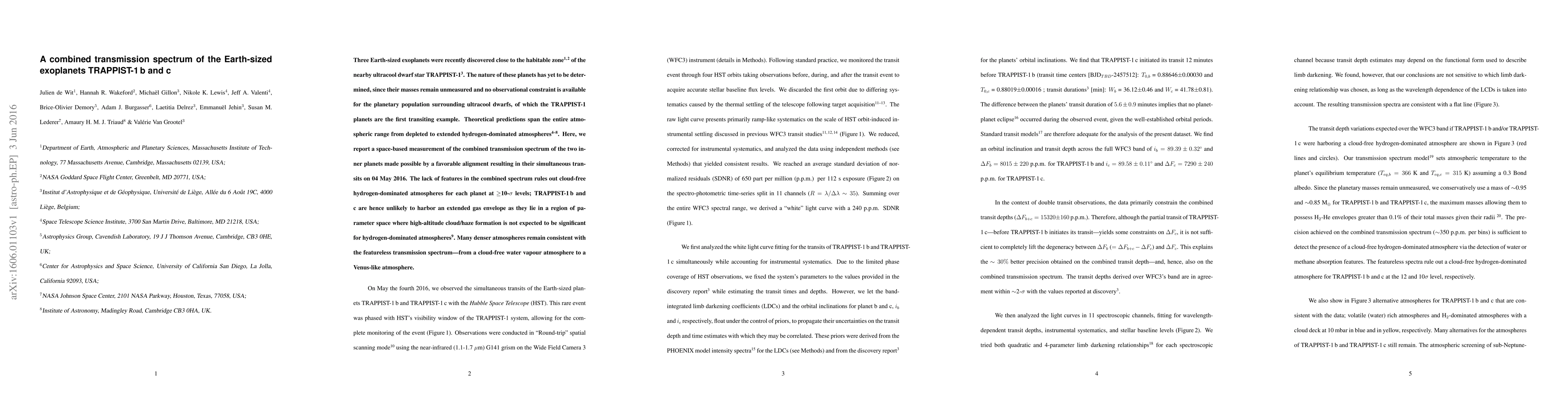 Three Earth-sized exoplanets were recently discovered close to the habitable zone of the nearby ultracool dwarf star TRAPPIST-1. The nature of these planets has yet to be determined, since their masses remain unmeasured and no observational constraint is available for the planetary population surrounding ultracool dwarfs, of which the TRAPPIST-1 planets are the first transiting example. Theoretical predictions span the entire atmospheric range from depleted to extended hydrogen-dominated atmospheres. Here, we report a space-based measurement of the combined transmission spectrum of the two inner planets made possible by a favorable alignment resulting in their simultaneous transits on 04 May 2016. The lack of features in the combined spectrum rules out cloud-free hydrogen-dominated atmospheres for each planet at 10-$\sigma$ levels; TRAPPIST-1 b and c are hence unlikely to harbor an extended gas envelope as they lie in a region of parameter space where high-altitude cloud/haze formation is not expected to be significant for hydrogen-dominated atmospheres. Many denser atmospheres remain consistent with the featureless transmission spectrum---from a cloud-free water vapour atmosphere to a Venus-like atmosphere.