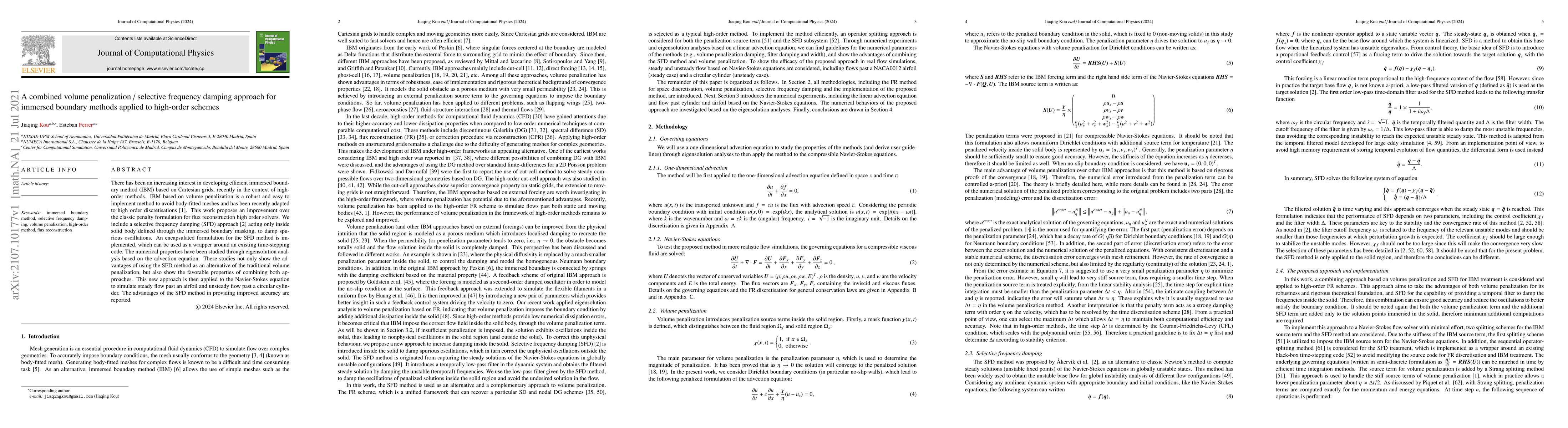 This research paper proposes a combined approach that improves efficiency in immersed boundary methods for high-order schemes by using selective frequency damping to reduce oscillations, offering advantages over traditional volume penalization methods.