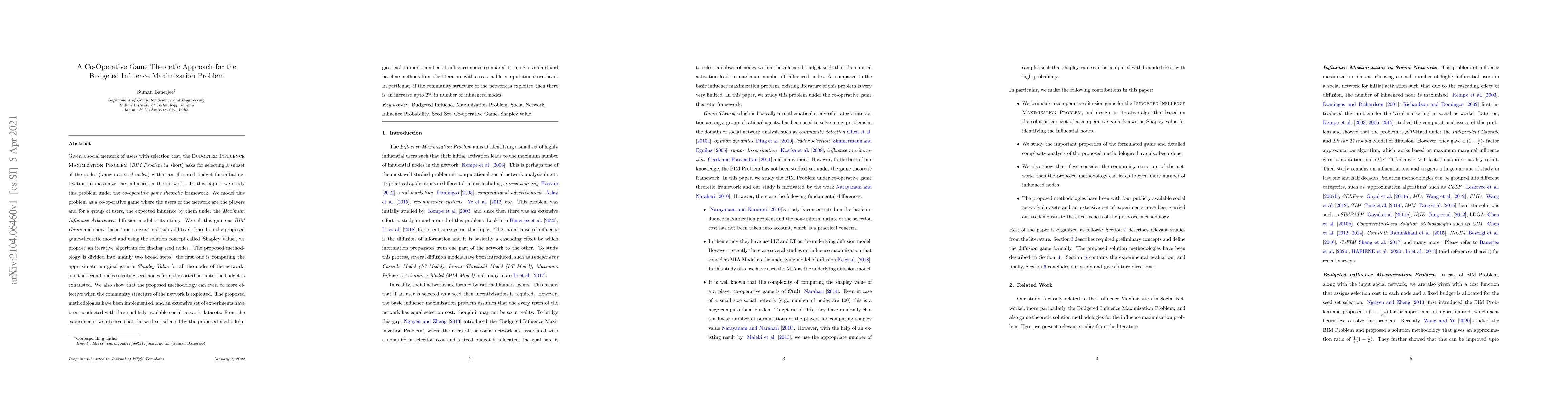 Given a social network of users with selection cost, the \textsc{Budgeted Influence Maximization Problem} (\emph{BIM Problem} in short) asks for selecting a subset of the nodes (known as \emph{seed nodes}) within an allocated budget for initial activation to maximize the influence in the network. In this paper, we study this problem under the \emph{co\mbox{-}operative game theoretic} framework. We model this problem as a co\mbox{-}operative game where the users of the network are the players and for a group of users, the expected influence by them under the \emph{Maximum Influence Arborences} diffusion model is its utility. We call this game as \emph{BIM Game} and show this is `non-convex' and `sub-additive'. Based on the proposed game\mbox{-}theoretic model and using the solution concept called `Shapley Value', we propose an iterative algorithm for finding seed nodes. The proposed methodology is divided into mainly two broad steps: the first one is computing the approximate marginal gain in \emph{Shapley Value} for all the nodes of the network, and the second one is selecting seed nodes from the sorted list until the budget is exhausted. We also show that the proposed methodology can even be more effective when the community structure of the network is exploited. The proposed methodologies have been implemented, and an extensive set of experiments have been conducted with three publicly available social network datasets. From the experiments, we observe that the seed set selected by the proposed methodologies lead to more number of influence nodes compared to many standard and baseline methods from the literature with a reasonable computational overhead. In particular, if the community structure of the network is exploited then there is an increase upto $2 \%$ in number of influenced nodes.