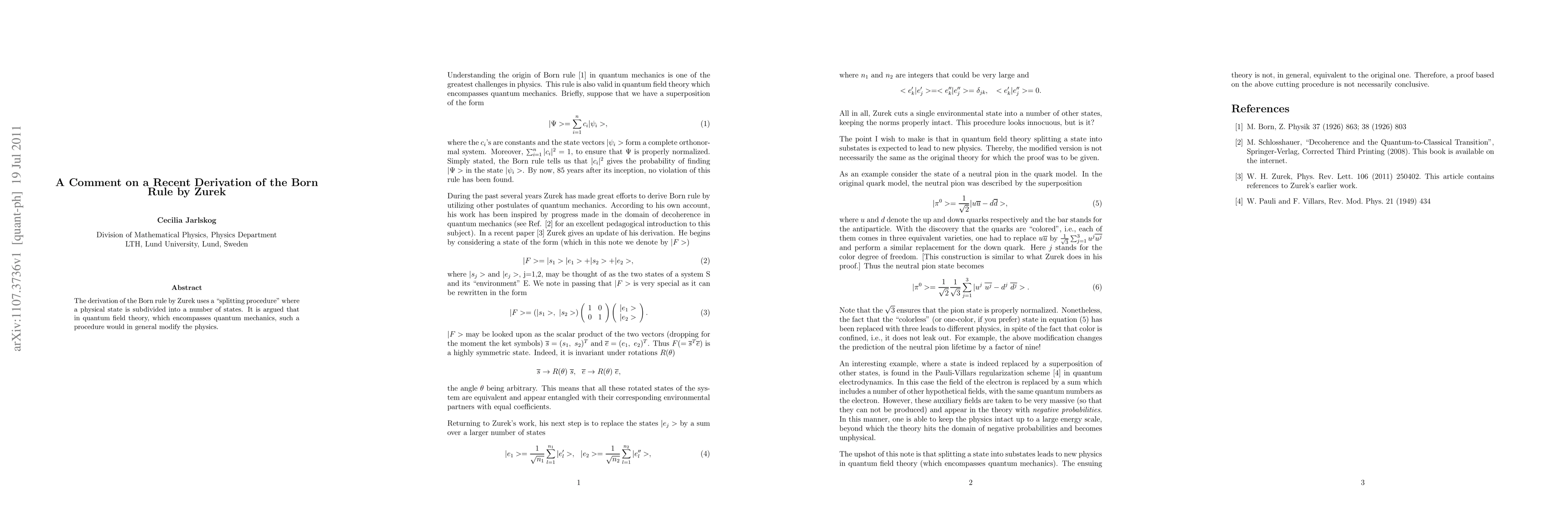 The paper critiques Zurek's derivation of the Born rule using a "splitting procedure," arguing that this method could alter physical outcomes in quantum field theory, which includes quantum mechanics. The critique highlights potential inconsistencies in applying this procedure broadly.