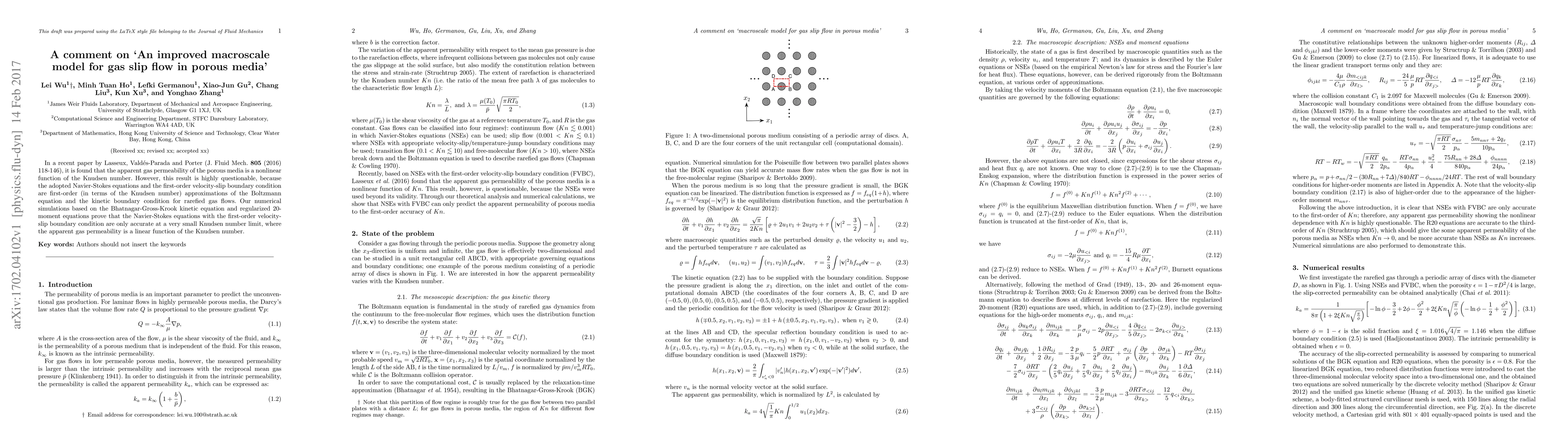 In a recent paper by Lasseux, Vald\'{e}s-Parada and Porter (J.~Fluid~Mech. \textbf{805} (2016) 118-146), it is found that the apparent gas permeability of the porous media is a nonlinear function of the Knudsen number. However, this result is highly questionable, because the adopted Navier-Stokes equations and the first-order velocity-slip boundary condition are first-order (in terms of the Knudsen number) approximations of the Boltzmann equation and the kinetic boundary condition for rarefied gas flows. Our numerical simulations based on the Bhatnagar-Gross-Krook kinetic equation and regularized 20-moment equations prove that the Navier-Stokes equations with the first-order velocity-slip boundary condition are only accurate at a very small Knudsen number limit, where the apparent gas permeability is a linear function of the Knudsen number.