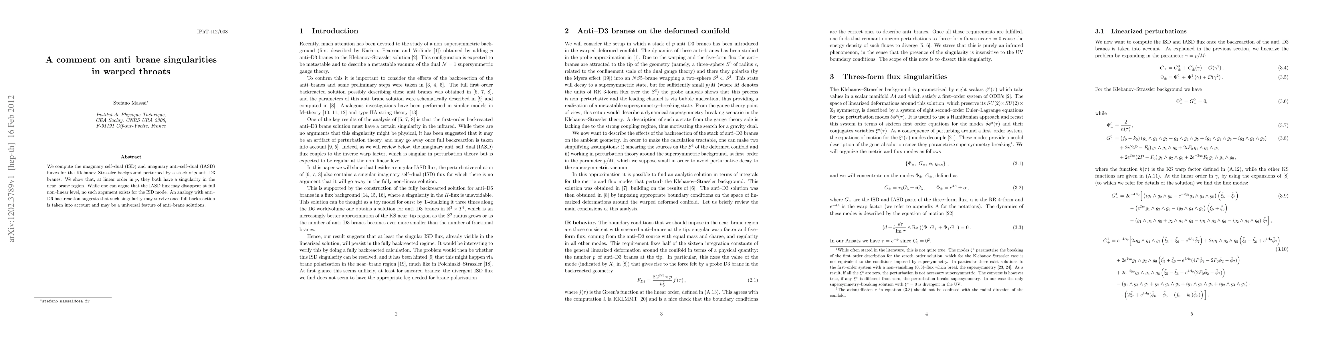We compute the imaginary self-dual (ISD) and imaginary anti-self-dual (IASD) fluxes for the Klebanov-Strassler background perturbed by a stack of p anti-D3 branes. We show that, at linear order in p, they both have a singularity in the near-brane region. While one can argue that the IASD flux may disappear at full non-linear level, no such argument exists for the ISD mode. An analogy with anti-D6 backreaction suggests that such singularity may survive once full backreaction is taken into account and may be a universal feature of anti-brane solutions.