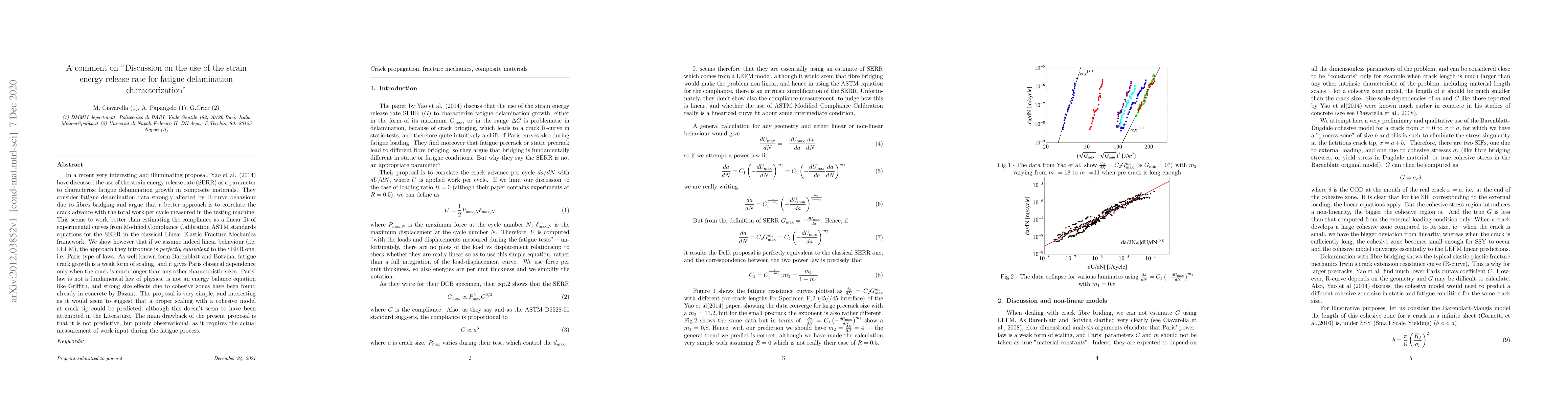 This paper critiques Yao et al.'s (2014) proposal to use total work per cycle instead of strain energy release rate (SERR) for fatigue delamination in composites, showing their approach is equivalent to SERR under linear behavior. It highlights that Paris' law is not a fundamental law and that cohesive models could better predict scaling, though this has not been explored. The main critique is that the proposal is observational rather than predictive.