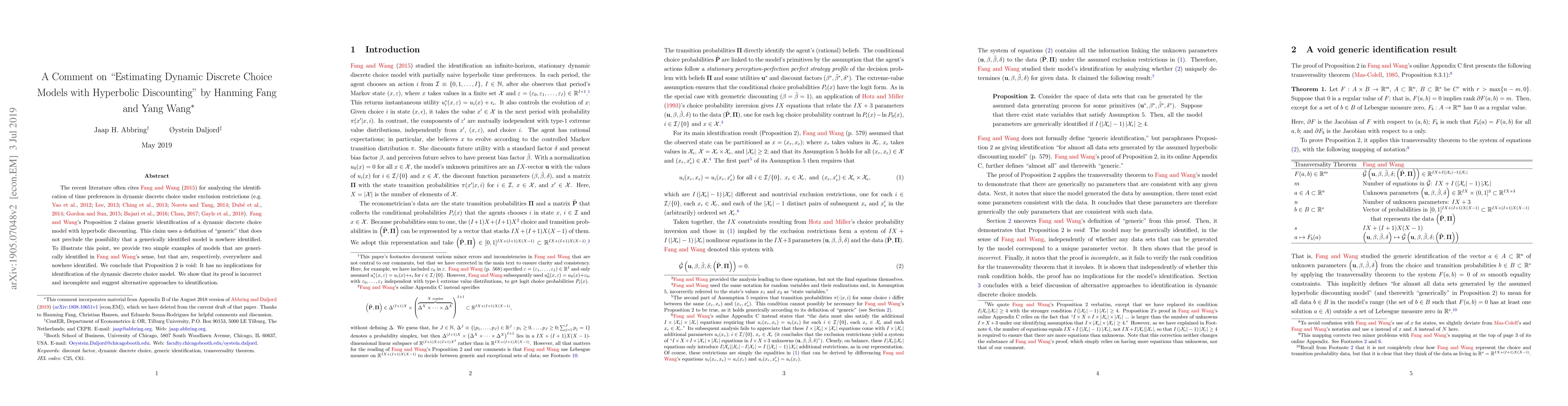 The recent literature often cites Fang and Wang (2015) for analyzing the identification of time preferences in dynamic discrete choice under exclusion restrictions (e.g. Yao et al., 2012; Lee, 2013; Ching et al., 2013; Norets and Tang, 2014; Dub\'e et al., 2014; Gordon and Sun, 2015; Bajari et al., 2016; Chan, 2017; Gayle et al., 2018). Fang and Wang's Proposition 2 claims generic identification of a dynamic discrete choice model with hyperbolic discounting. This claim uses a definition of "generic" that does not preclude the possibility that a generically identified model is nowhere identified. To illustrate this point, we provide two simple examples of models that are generically identified in Fang and Wang's sense, but that are, respectively, everywhere and nowhere identified. We conclude that Proposition 2 is void: It has no implications for identification of the dynamic discrete choice model. We show that its proof is incorrect and incomplete and suggest alternative approaches to identification.