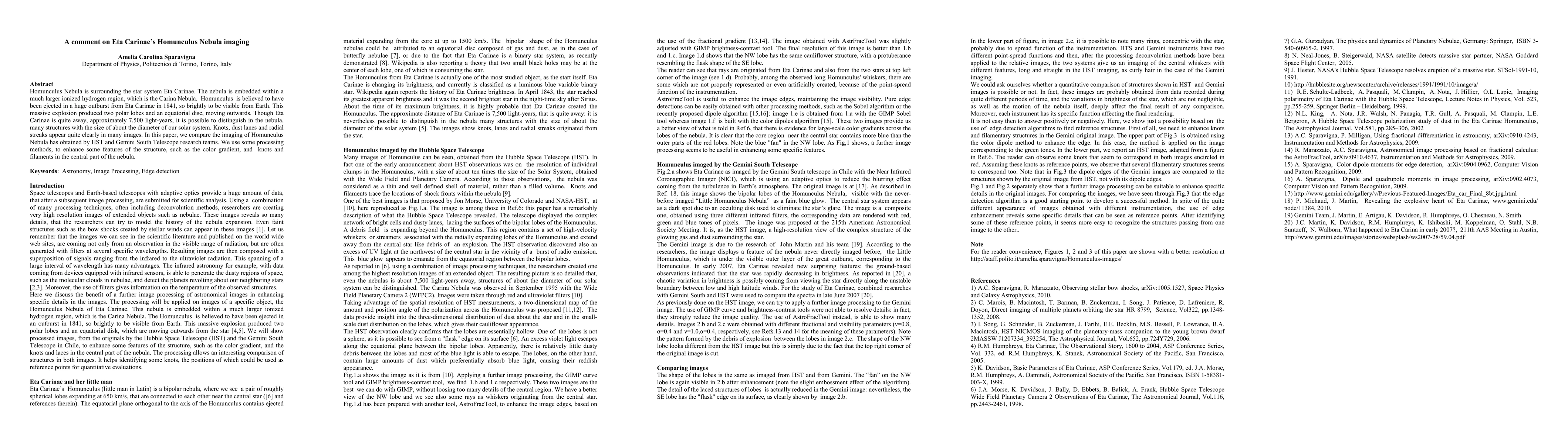 Homunculus Nebula is surrounding the star system Eta Carinae. The nebula is embedded within a much larger ionized hydrogen region, which is the Carina Nebula. Homunculus is believed to have been ejected in a huge outburst from Eta Carinae in 1841, so brightly to be visible from Earth. This massive explosion produced two polar lobes and an equatorial disc, moving outwards. Though Eta Carinae is quite away, approximately 7,500 light-years, it is possible to distinguish in the nebula, many structures with the size of about the diameter of our solar system. Knots, dust lanes and radial streaks appear quite clearly in many images. In this paper, we compare the imaging of Homunculus Nebula has obtained by HST and Gemini South Telescope research teams. We use some processing methods, to enhance some features of the structure, such as the color gradient, and knots and filaments in the central part of the nebula.