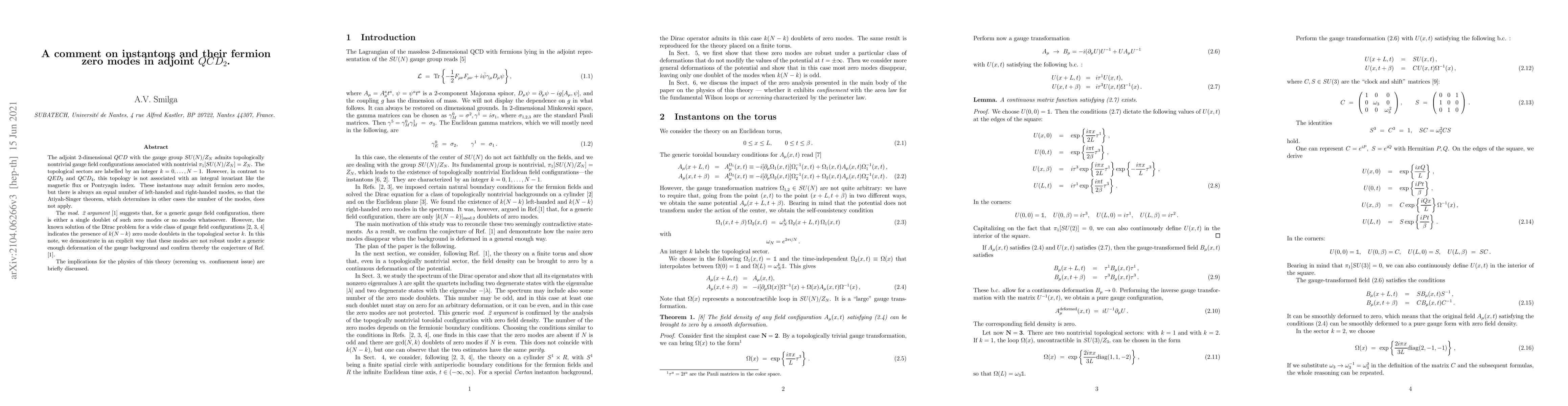 The adjoint 2-dimensional $QCD$ with the gauge group $SU(N)/Z_N$ admits topologically nontrivial gauge field configurations associated with nontrivial $\pi_1[SU(N)/Z_N] = Z_N$. The topological sectors are labelled by an integer $k=0,\ldots, N-1$. However, in contrast to $QED_2$ and $QCD_4$, this topology is not associated with an integral invariant like the magnetic flux or Pontryagin index. These instantons may admit fermion zero modes, but there is always an equal number of left-handed and right-handed modes, so that the Atiyah-Singer theorem, which determines in other cases the number of the modes, does not apply. The mod. 2 argument suggests that, for a generic gauge field configuration, there is either a single doublet of such zero modes or no modes whatsoever. However, the known solution of the Dirac problem for a wide class of gauge field configurations indicates the presence of $k(N-k)$ zero mode doublets in the topological sector $k$. In this note, we demonstrate in an explicit way that these modes are not robust under a generic enough deformation of the gauge background and confirm thereby the mod. 2 conjecture. The implications for the physics of this theory (screening vs. confinement issue) are briefly discussed.