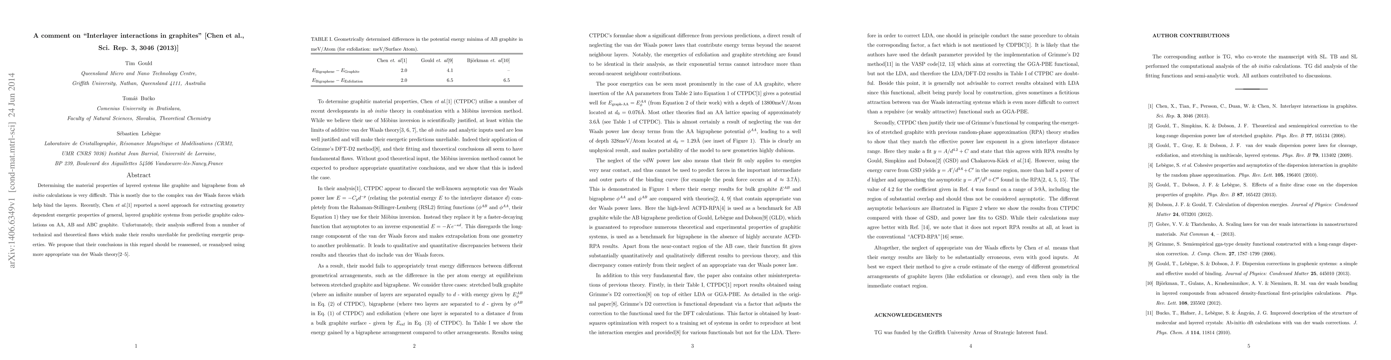 Determining the material properties of layered systems like graphite and bigraphene from \emph{ab initio} calculations is very difficult. This is mostly due to the complex van der Waals forces which help bind the layers. Recently, Chen~\emph{et al.} [Chen et al., Sci. Rep. 3, 3046 (2013)] reported a novel approach for extracting geometry dependent energetic properties of general, layered graphitic systems from periodic graphite calculations on AA, AB and ABC graphite. Unfortunately, their analysis suffered from a number of technical and theoretical flaws which make their results unreliable for predicting energetic properties. We propose that their conclusions in this regard should be reassessed, or reanalysed using more appropriate van der Waals theory.