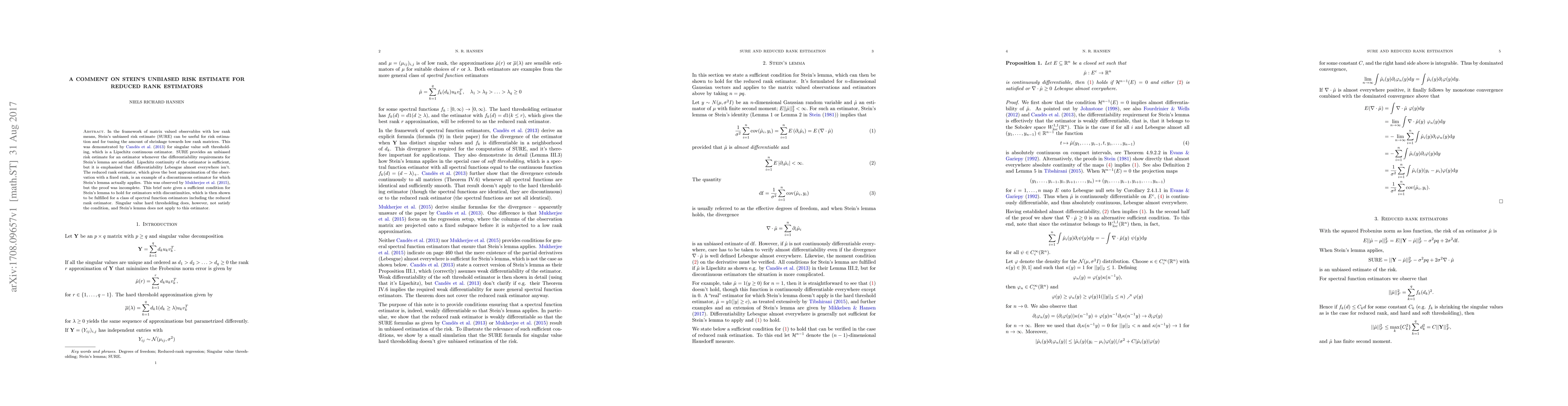 This paper discusses Stein's unbiased risk estimate (SURE) for reduced rank estimators, demonstrating its applicability for risk estimation and tuning shrinkage towards low rank matrices. It clarifies that while Lipschitz continuity is sufficient for Stein's lemma, differentiability almost everywhere is not. The paper provides a condition for Stein's lemma to hold for discontinuous estimators, proving it for a class of spectral function estimators including the reduced rank estimator, but noting that singular value hard thresholding does not meet this condition.