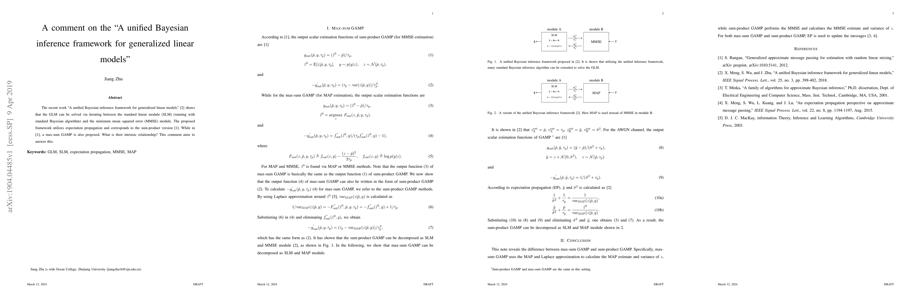 This comment investigates the intrinsic relationship between the unified Bayesian inference framework for generalized linear models, which iterates between the standard linear module and the minimum mean squared error module, and the sum-product version, contrasting it with the max-sum GAMP approach proposed in another study.