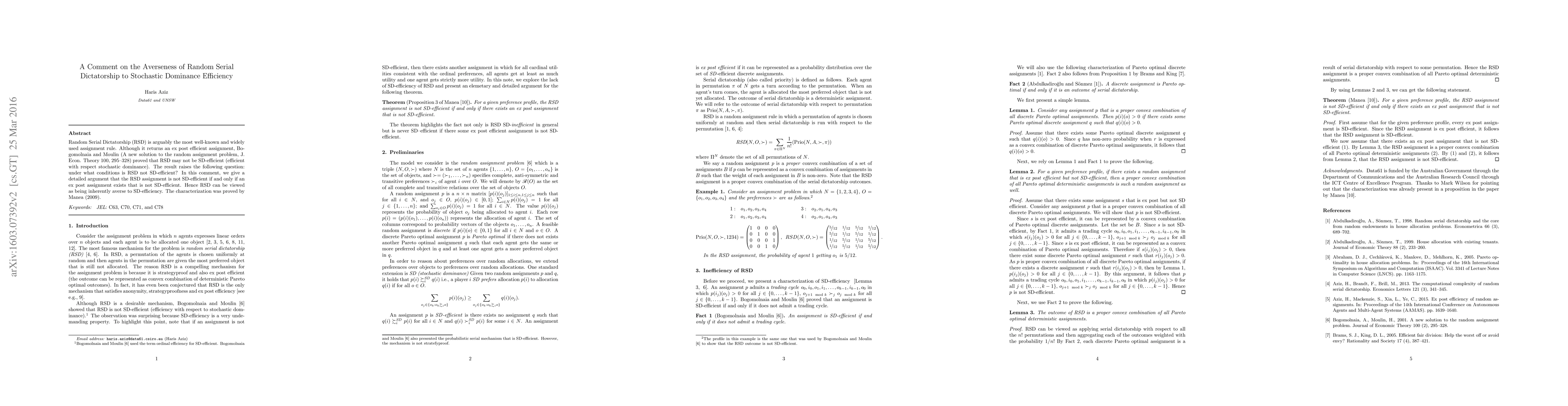 Random Serial Dictatorship (RSD) is arguably the most well-known and widely used assignment rule. Although it returns an ex post efficient assignment, Bogomolnaia and Moulin (A new solution to the random assignment problem, J. Econ. Theory 100, 295--328) proved that RSD may not be SD-efficient (efficient with respect stochastic dominance). The result raises the following question: under what conditions is RSD not SD-efficient? In this comment, we give a detailed argument that the RSD assignment is not SD-efficient if and only if an ex post assignment exists that is not SD-efficient. Hence RSD can be viewed as being inherently averse to SD-efficiency. The characterization was proved by Manea (2009).