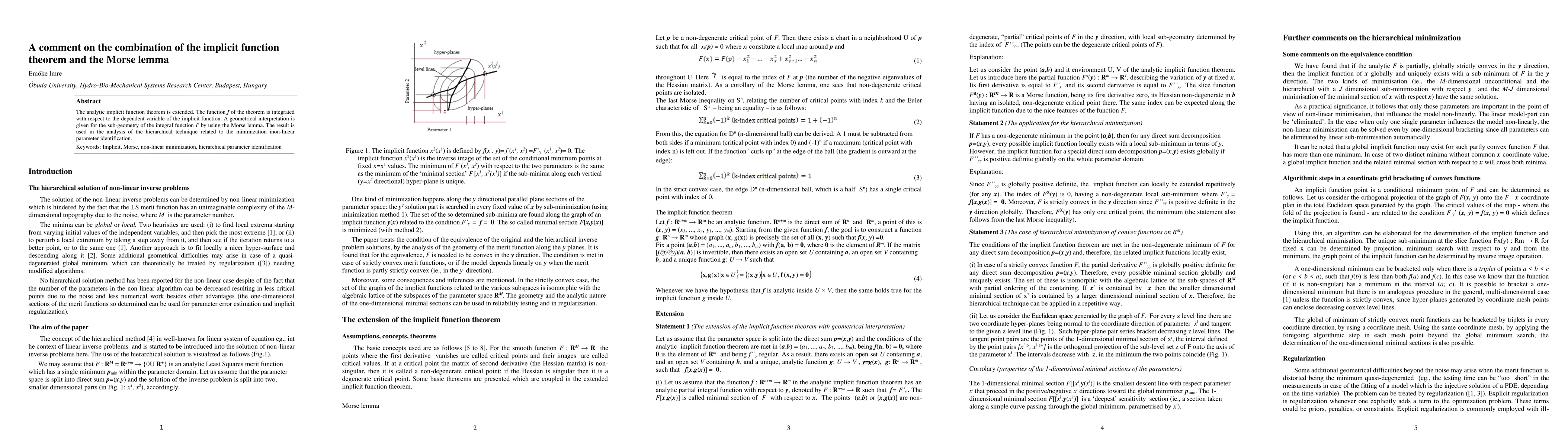 The analytic implicit function theorem is extended. The function f of the theorem is integrated with respect to the dependent variable of the implicit function. A geometrical interpretation is given for the sub-geometry of the integral function F by using the Morse lemma. The result is used in the analysis of the hierarchical technique related to the minimization inon-linear parameter identification.