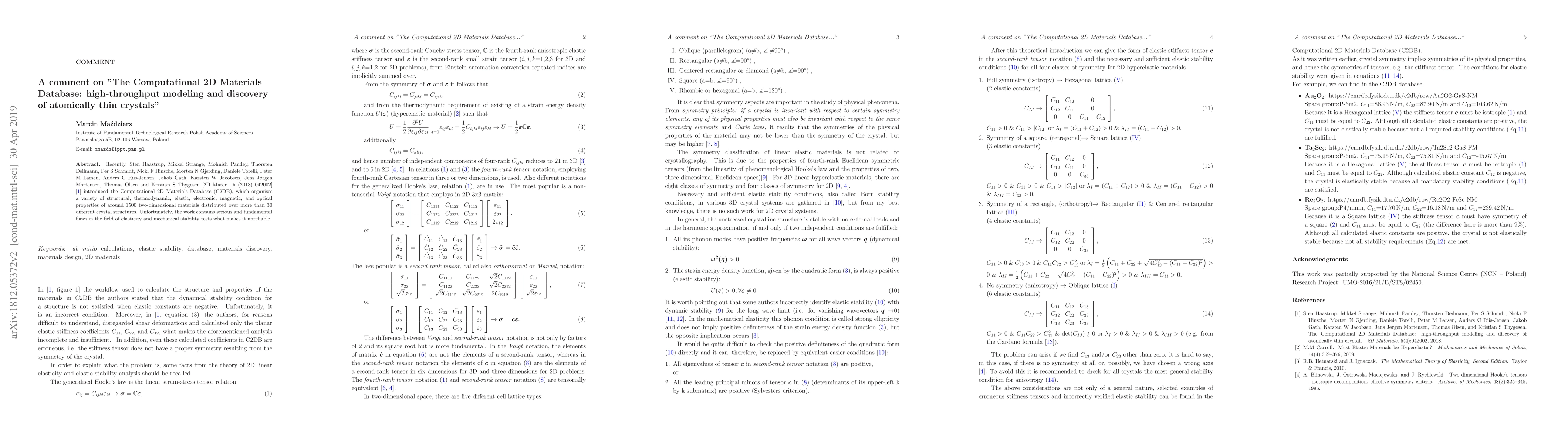 Recently, Sten Haastrup, Mikkel Strange, Mohnish Pandey, Thorsten Deilmann, Per S Schmidt, Nicki F Hinsche, Morten N Gjerding, Daniele Torelli, Peter M Larsen, Anders C Riis-Jensen, Jakob Gath, Karsten W Jacobsen, Jens Jrgen Mortensen, Thomas Olsen and Kristian S Thygesen [2D Mater. 5 (2018) 042002] introduced the Computational 2D Materials Database (C2DB), which organises a variety of structural, thermodynamic, elastic, electronic, magnetic, and optical properties of around 1500 two-dimensional materials distributed over more than 30 different crystal structures. Unfortunately, the work contains serious and fundamental flaws in the field of elasticity and mechanical stability tests what makes it unreliable.