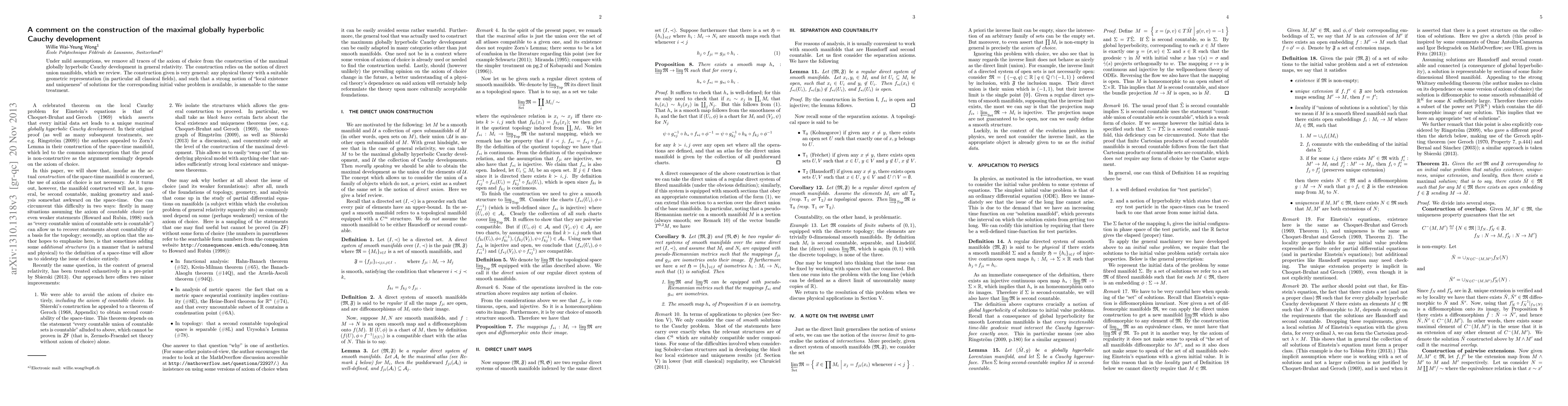 Under mild assumptions, we remove all traces of the axiom of choice from the construction of the maximal globally hyperbolic Cauchy development in general relativity. The construction relies on the notion of direct union manifolds, which we review. The construction given is very general: any physical theory with a suitable geometric representation (in particular all classical fields), and such that a strong notion of "local existence and uniqueness" of solutions for the corresponding initial value problem is available, is amenable to the same treatment.