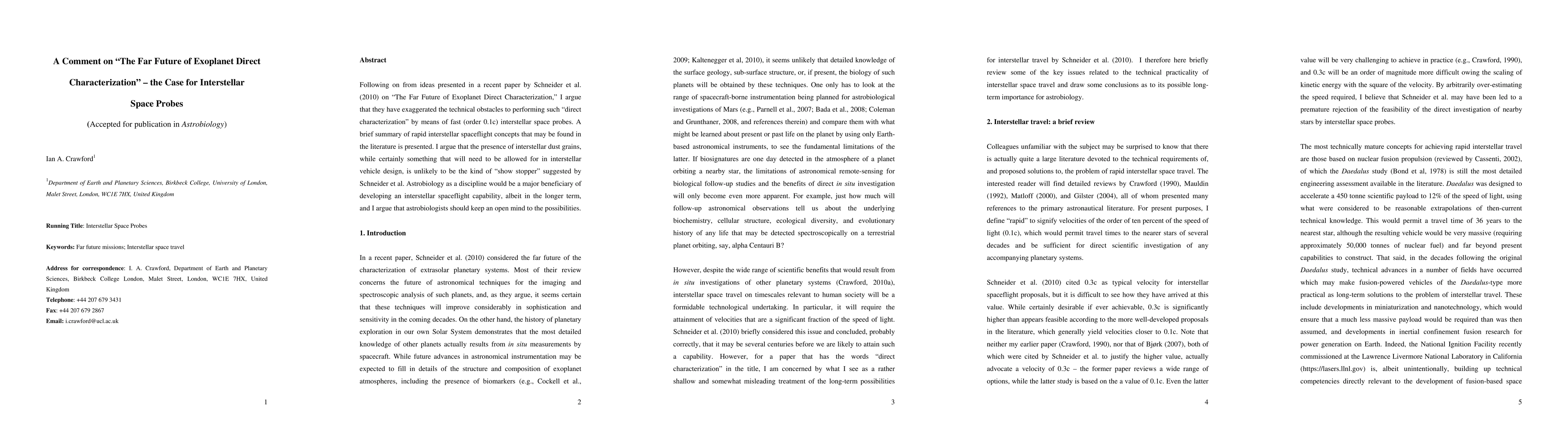 Following on from ideas presented in a recent paper by Schneider et al. (2010) on "The Far Future of Exoplanet Direct Characterization", I argue that they have exaggerated the technical obstacles to performing such 'direct characterization' by means of fast (order 0.1c) interstellar space probes. A brief summary of rapid interstellar spaceflight concepts that may be found in the literature is presented. I argue that the presence of interstellar dust grains, while certainly something which will need to be allowed for in interstellar vehicle design, is unlikely to be the kind of 'show stopper' suggested by Schneider et al. Astrobiology as a discipline would be a major beneficiary of developing an interstellar spaceflight capability, albeit in the longer term, and I argue that astrobiologists should keep an open mind to the possibilities.